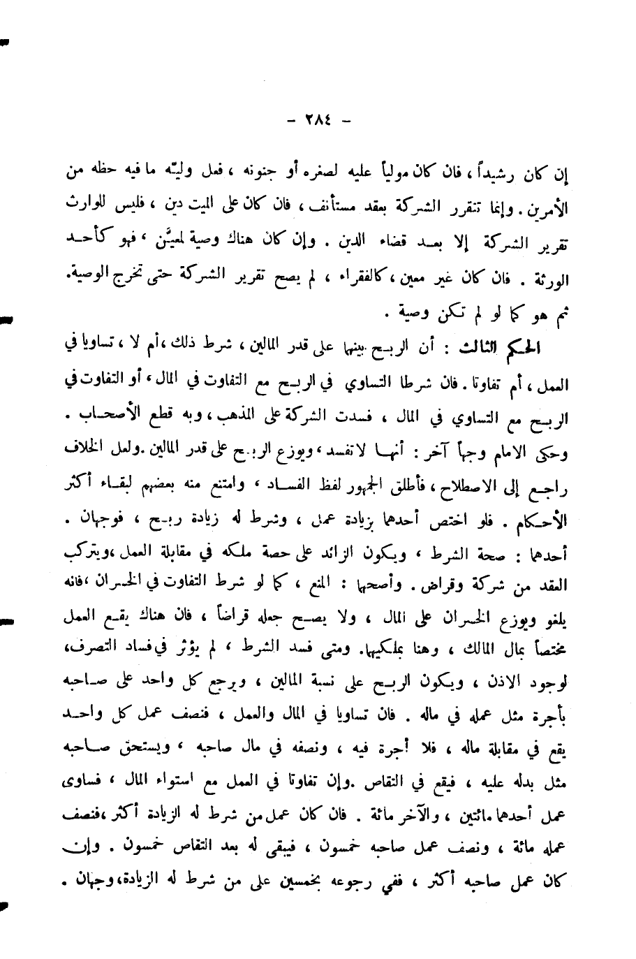 إِنْ كَانَ رَشِيدًا، فَإِنْ كَانَ مُوَلَّيًا عَلَيْهِ لِصِغَرِهِ أَوْ جُنُونِهِ، فَعَلَ وَلِيُّهُ مَا فِيهِ حَظُّهُ مِنَ الْأَمْرَيْنِ. وَإِنَّمَا تَتَقَرَّرُ الشَّرِكَةُ بِعَقْدٍ مُسْتَأْنَفٍ، فَإِنْ كَانَ عَلَى الْمَيِّتِ دَيْنٌ، فَلَيْسَ لِلْوَارِثِ تَقْرِيرُ الشَّرِكَةِ إِلَّا بَعْدَ قَضَاءِ الدَّيْنِ. وَإِنْ كَانَ هُنَاكَ وَصِيَّةٌ لِمُعَيَّنٍ فَهُوَ كَأَحَدِ الْوَرَثَةِ. فَإِنْ كَانَ غَيْرَ مُعَيَّنٍ، كَالْفُقَرَاءِ، لَمْ يَصِحَّ تَقْرِيرُ الشَّرِكَةِ حَتَّى تَخْرُجَ الْوَصِيَّةُ. ثُمَّ هُوَ كَمَا لَوْ لَمْ تَكُنْ وَصِيَّةٌ.