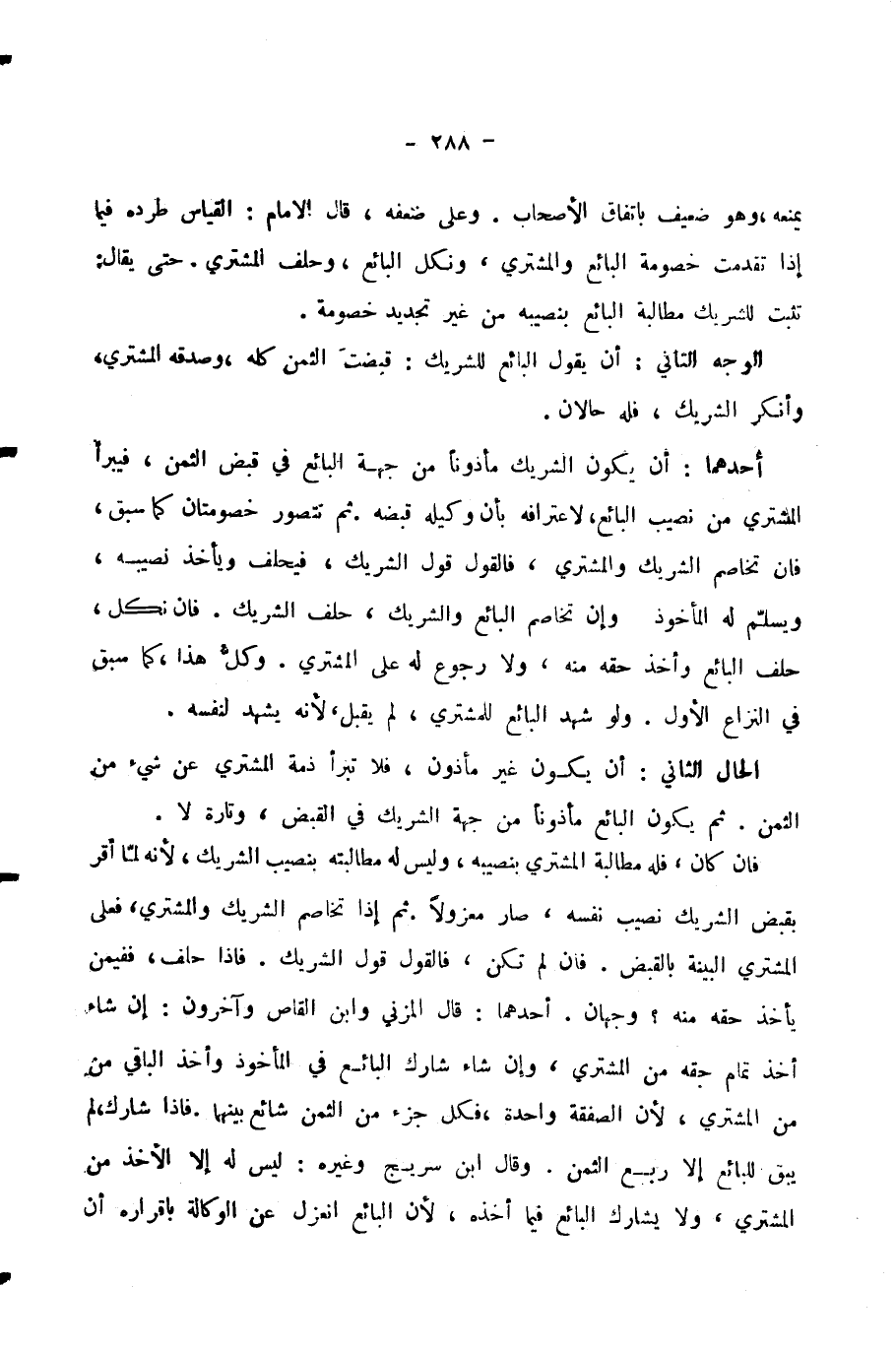 الْحَالُ الثَّانِي: أَنْ يَكُونَ غَيْرَ مَأْذُونٍ، فَلَا تَبْرَأُ ذِمَّةُ الْمُشْتَرِي عَنْ شَيْءٍ مِنَ الثَّمَنِ. ثُمَّ يَكُونُ الْبَائِعُ مَأْذُونًا مِنْ جِهَةِ الشَّرِيكِ فِي الْقَبْضِ، وَتَارَةً لَا. فَإِنْ كَانَ، فَلَهُ مُطَالَبَةُ الْمُشْتَرِي بِنَصِيبِهِ، وَلَيْسَ لَهُ مُطَالَبَةٌ بِنَصِيبِ الشَّرِيكِ؛ لِأَنَّهُ لَمَّا أَقَرَّ بِقَبْضِ الشَّرِيكِ نَصِيبَ نَفْسِهِ، صَارَ مَعْزُولًا. ثُمَّ إِذَا تَخَاصَمَ الشَّرِيكُ وَالْمُشْتَرِي، فَعَلَى الْمُشْتَرِي الْبَيِّنَةُ بِالْقَبْضِ. فَإِنْ لَمْ تَكُنْ، فَالْقَوْلُ قَوْلُ الشَّرِيكِ. فَإِذَا حَلَفَ، فَفِيمَنْ يَأْخُذُ حَقَّهُ مِنْهُ؟ وَجْهَانِ. أَحَدُهُمَا: قَالَ الْمُزَنِيُّ وَابْنُ الْقَاصِّ وَآخَرُونَ: إِنْ شَاءَ أَخَذَ تَمَامَ حَقِّهِ مِنَ الْمُشْتَرِي، وَإِنْ شَاءَ شَارَكَ الْبَائِعَ فِي الْمَأْخُوذِ وَأَخَذَ الْبَاقِيَ مِنَ الْمُشْتَرِي؛ لِأَنَّ الصَّفْقَةَ وَاحِدَةٌ، فَكُلُّ جُزْءٍ مِنَ الثَّمَنِ شَائِعٌ بَيْنَهُمَا. فَإِذَا شَارَكَ، لَمْ يَبْقَ لِلْبَائِعِ إِلَّا رُبُعُ الثَّمَنِ. وَقَالَ ابْنُ سُرَيْجٍ وَغَيْرُهُ: لَيْسَ لَهُ إِلَّا الْأَخْذُ مِنَ الْمُشْتَرِي، وَلَا يُشَارِكُ الْبَائِعَ فِيمَا أَخَذَهُ؛ لِأَنَّ الْبَائِعَ انْعَزَلَ عَنِ الْوَكَالَةِ بِإِقْرَارِ أَنَّ