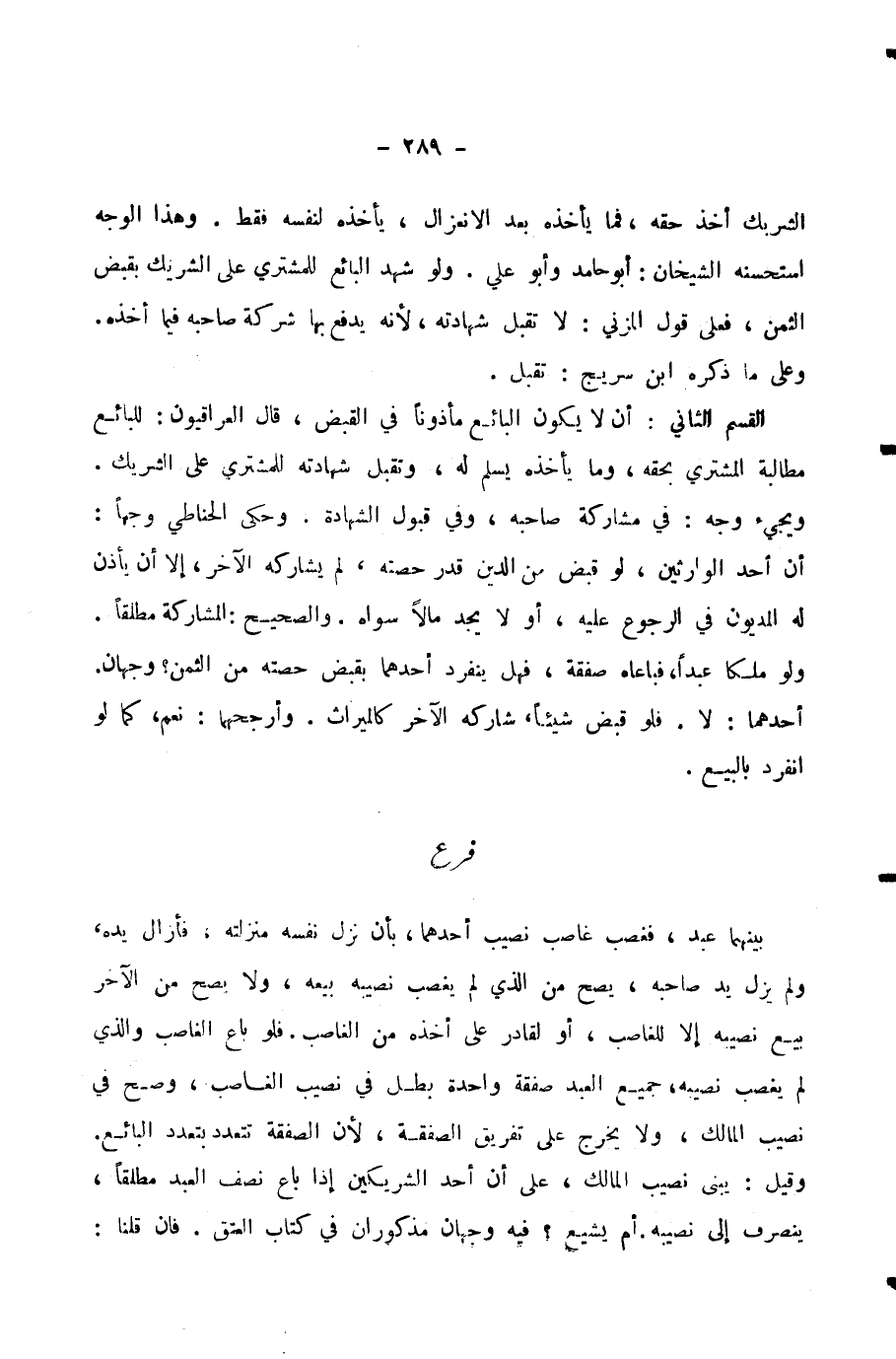 الْقِسْمُ الثَّانِي: أَنْ لَا يَكُونَ الْبَائِعُ مَأْذُونًا فِي الْقَبْضِ، قَالَ الْعِرَاقِيُّونَ: لِلْبَائِعِ مُطَالَبَةُ الْمُشْتَرِي بِحَقِّهِ، وَمَا يَأْخُذُهُ يُسَلَّمُ لَهُ، وَتُقْبَلُ شَهَادَتُهُ لِلْمُشْتَرِي عَلَى الشَّرِيكِ. وَيَجِيءُ وَجْهٌ: فِي مُشَارَكَةِ صَاحِبِهِ، وَفِي قَبُولِ الشَّهَادَةِ. وَحَكَى الْحَنَّاطِيُّ وَجْهًا: أَنَّ أَحَدَ الْوَارِثِينَ، لَوْ قَبَضَ مِنَ الدَّيْنِ قَدْرَ حِصَّتِهِ، لَمْ يُشَارِكْهُ الْآخَرُ، إِلَّا أَنْ يَأْذَنَ لَهُ الْمَدْيُونُ فِي الرُّجُوعِ عَلَيْهِ، أَوْ لَا يَجِدُ مَالًا سِوَاهُ. وَالصَّحِيحُ: الْمُشَارَكَةُ مُطْلَقًا. وَلَوْ مَلَكَا عَبْدًا، فَبَاعَاهُ صَفْقَةً، فَهَلْ يَنْفَرِدُ أَحَدُهُمَا بِقَبْضِ حِصَّتِهِ مِنَ الثَّمَنِ؟ وَجْهَانِ. أَحَدُهُمَا: لَا. فَلَوْ قَبَضَ شَيْئًا، شَارَكَهُ الْآخَرُ كَالْمِيرَاثِ. وَأَرْجَحُهُمَا: نَعَمْ، كَمَا لَوِ انْفَرَدَ بِالْبَيْعِ.
