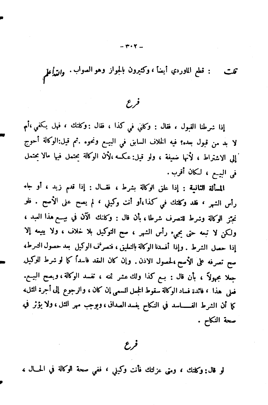 الْمَسْأَلَةُ الثَّانِيَةُ: إِذَا عَلَّقَ الْوَكَالَةَ بِشَرْطٍ، فَقَالَ: إِذَا قَدِمَ زَيْدٌ، أَوْ جَاءَ رَأْسُ الشَّهْرِ، فَقَدْ وَكَّلْتُكَ فِي كَذَا، أَوْ أَنْتَ وَكِيلِي، لَمْ يَصِحَّ عَلَى الْأَصَحِّ. فَلَوْ نَجَّزَ الْوَكَالَةَ وَشَرَطَ لِلتَّصَرُّفِ شَرْطًا، بِأَنْ قَالَ: وَكَّلْتُكَ الْآنَ فِي بَيْعِ هَذَا الْعَبْدِ، وَلَكِنْ لَا تَبِعْهُ حَتَّى يَجِيءَ رَأْسُ الشَّهْرِ، صَحَّ التَّوْكِيلُ بِلَا خِلَافٍ، وَلَا يَبِيعُهُ إِلَّا إِذَا حَصَلَ الشَّرْطُ. وَإِذَا أَفْسَدْنَا الْوَكَالَةَ بِالتَّعْلِيقِ، فَتَصَرَّفَ الْوَكِيلُ بَعْدَ حُصُولِ الشَّرْطِ، صَحَّ تَصَرُّفُهُ عَلَى الْأَصَحِّ، لِحُصُولِ الْإِذْنِ. وَإِنْ كَانَ الْعَقْدُ فَاسِدًا كَمَا لَوْ شَرَطَ لِلْوَكِيلِ جَعْلًا مَجْهُولًا، بِأَنْ قَالَ: بِعْ كَذَا وَلَكَ عُشْرُ ثَمَنِهِ، تَفْسُدُ الْوَكَالَةُ، وَيَصِحُّ الْبَيْعُ. فَعَلَى هَذَا، فَائِدَةُ فَسَادِ الْوَكَالَةِ سُقُوطُ الْجَعْلِ الْمُسَمَّى إِنْ كَانَ، وَالرُّجُوعُ إِلَى أُجْرَةِ الْمِثْلِ، كَمَا أَنَّ الشَّرْطَ الْفَاسِدَ فِي النِّكَاحِ يُفْسِدُ الصَّدَاقَ، وَيُوجِبُ مَهْرَ الْمِثْلِ، وَلَا يُؤَثِّرُ فِي صِحَّةِ النِّكَاحِ.