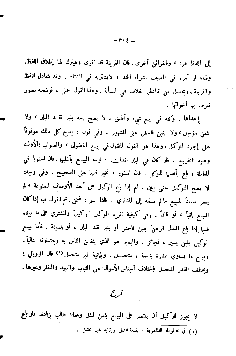 إِحْدَاهَا: وَكَّلَهُ فِي بَيْعِ شَيْءٍ وَأَطْلَقَ، لَا يَصِحُّ بَيْعُهُ بِغَيْرِ نَقْدِ الْبَلَدِ، وَلَا بِثَمَنٍ مُؤَجَّلٍ، وَلَا بِغَبْنٍ فَاحِشٍ عَلَى الْمَشْهُورِ. وَفِي قَوْلٍ: يَصِحُّ كُلُّ ذَلِكَ مَوْقُوفًا عَلَى إِجَازَةِ الْمُوَكِّلِ، وَهَذَا هُوَ الْقَوْلُ الْمَنْقُولُ فِي بَيْعِ الْفُضُولِيِّ، وَالصَّوَابُ: الْأَوَّلُ، وَعَلَيْهِ التَّفْرِيعُ. فَلَوْ كَانَ فِي الْبَلَدِ نَقْدَانِ، لَزِمَهُ الْبَيْعُ بِأَغْلَبِهِمَا. فَإِنِ اسْتَوَيَا فِي الْمُعَامَلَةِ، بَاعَ بِأَنْفَعِهِمَا لِلْمُوَكِّلِ. فَإِنِ اسْتَوَيَا، تَخَيَّرَ فِيهِمَا عَلَى الصَّحِيحِ. وَفِي وَجْهٍ: لَا يَصِحُّ التَّوْكِيلُ حَتَّى يُبَيِّنَ. ثُمَّ إِذَا بَاعَ الْوَكِيلُ عَلَى أَحَدِ الْأَوْصَافِ الْمَمْنُوعَةِ، لَمْ يَصِرْ ضَامِنًا لِلْمَبِيعِ مَا لَمْ يُسَلِّمْهُ إِلَى الْمُشْتَرِي. فَإِذَا سَلَّمَ، ضَمِنَ. ثُمَّ الْقَوْلُ فِيهِ إِذَا كَانَ الْمَبِيعُ بَاقِيًا، أَوْ تَالِفًا. وَفِي كَيْفِيَّةِ تَغْرِيمِ الْمُوَكِّلِ الْوَكِيلَ وَالْمُشْتَرِي عَلَى مَا بَيَّنَّاهُ فِيمَا إِذَا بَاعَ الْعَدْلُ الرَّهْنَ بِغَبْنٍ فَاحِشٍ أَوْ بِغَيْرِ نَقْدِ الْبَلَدِ، أَوْ بِنَسِيئَةٍ. فَأَمَّا بَيْعُ الْوَكِيلِ بِغَبْنٍ يَسِيرٍ، فَجَائِزٌ. وَالْيَسِيرُ هُوَ الَّذِي يَتَغَابَنُ النَّاسُ بِهِ وَيَحْتَمِلُونَهُ غَالِبًا. وَبَيْعُ مَا يُسَاوِي عَشَرَةً بِتِسْعَةٍ، مُتَحَمَّلٌ. وَبِثَمَانِيَةٍ غَيْرُ مُتَحَمَّلٍ قَالَ الرُّويَانِيُّ: وَيَخْتَلِفُ الْقَدْرُ الْمُتَحَمَّلُ بِاخْتِلَافِ أَجْنَاسِ الثِّيَابِ مِنَ الثِّيَابِ وَالْعَبِيدِ وَالْعَقَارِ وَغَيْرِهَا.