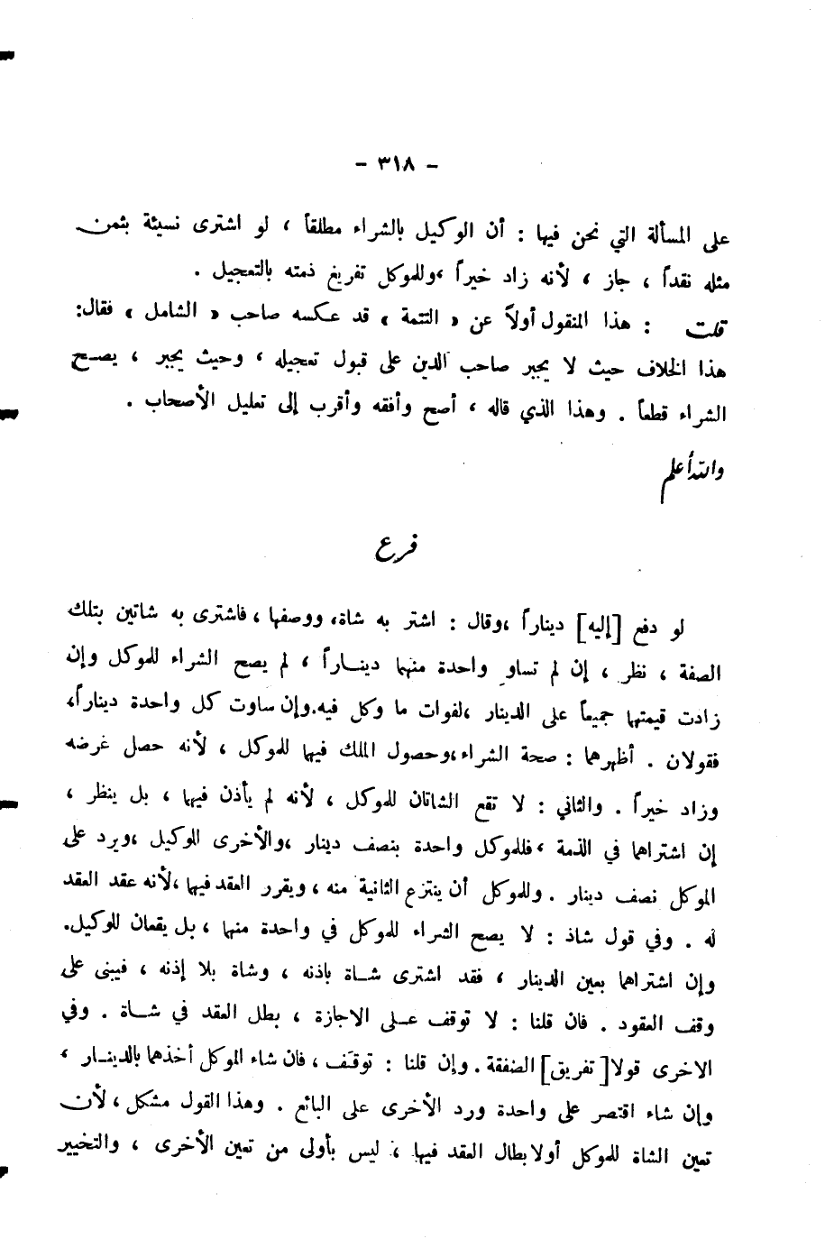 عَلَى الْمَسْأَلَةِ الَّتِي نَحْنُ فِيهَا: أَنَّ الْوَكِيلَ بِالشِّرَاءِ مُطْلَقًا، لَوِ اشْتَرَى نَسِيئَةً بِثَمَنِ مِثْلِهِ نَقْدًا، جَازَ؛ لِأَنَّهُ زَادَ خَيْرًا، وَلِلْمُوَكِّلِ تَفْرِيغُ ذِمَّتِهِ بِالتَّعْجِيلِ.