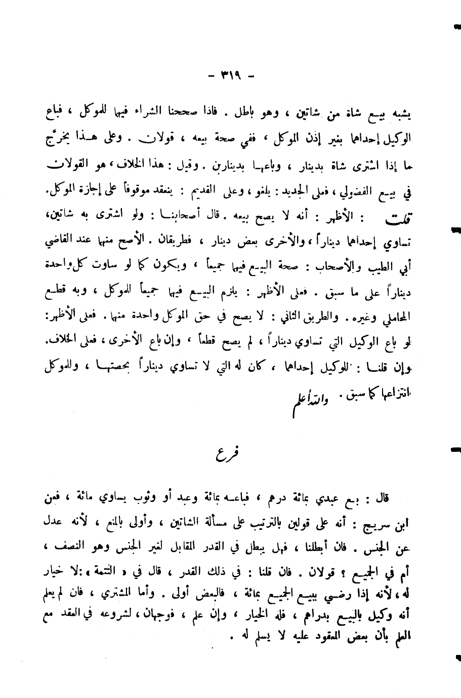 يُشْبِهُ بَيْعَ شَاةٍ مِنْ شَاتَيْنِ، وَهُوَ بَاطِلٌ. فَإِذَا صَحَّحْنَا الشِّرَاءَ فِيهِمَا لِلْمُوَكِّلِ، فَبَاعَ الْوَكِيلُ إِحْدَاهُمَا بِغَيْرِ إِذْنِ الْمُوَكِّلِ، فَفِي صِحَّةِ بَيْعِهِ، قَوْلَانِ. وَعَلَى هَذَا يَخْرُجُ مَا إِذَا اشْتَرَى شَاةً بِدِينَارٍ، وَبَاعَهَا بِدِينَارَيْنِ. وَقِيلَ: هَذَا الْخِلَافُ، هُوَ الْقَوْلَانِ فِي بَيْعِ الْفُضُولِيِّ، فَعَلَى الْجَدِيدِ: يَلْغُو، وَعَلَى الْقَدِيمِ: يَنْعَقِدُ مَوْقُوفًا عَلَى إِجَازَةِ الْمُوَكِّلِ.