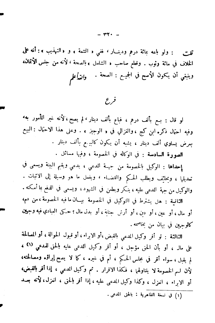 الصُّورَةُ السَّادِسَةُ: فِي الْوَكَالَةِ فِي الْخُصُومَةِ، وَفِيهَا مَسَائِلُ. إِحْدَاهَا: الْوَكِيلُ بِالْخُصُومَةِ مِنْ جِهَةِ الْمُدَّعِي، يَدَّعِي وَيُقِيمُ الْبَيِّنَةَ وَيَسْعَى فِي تَعْدِيلِهَا، وَيَحْلِفُ وَيَطْلُبُ الْحُكْمَ وَالْقَضَاءَ، وَيَفْعَلُ مَا هُوَ وَسِيلَةٌ إِلَى الْإِثْبَاتِ. وَالْوَكِيلُ مِنْ جِهَةِ الْمُدَّعَى عَلَيْهِ، يُنْكِرُ وَيَطْعَنُ فِي الشُّهُودِ، وَيَسْعَى فِي الدَّفْعِ بِمَا أَمْكَنَهُ.
