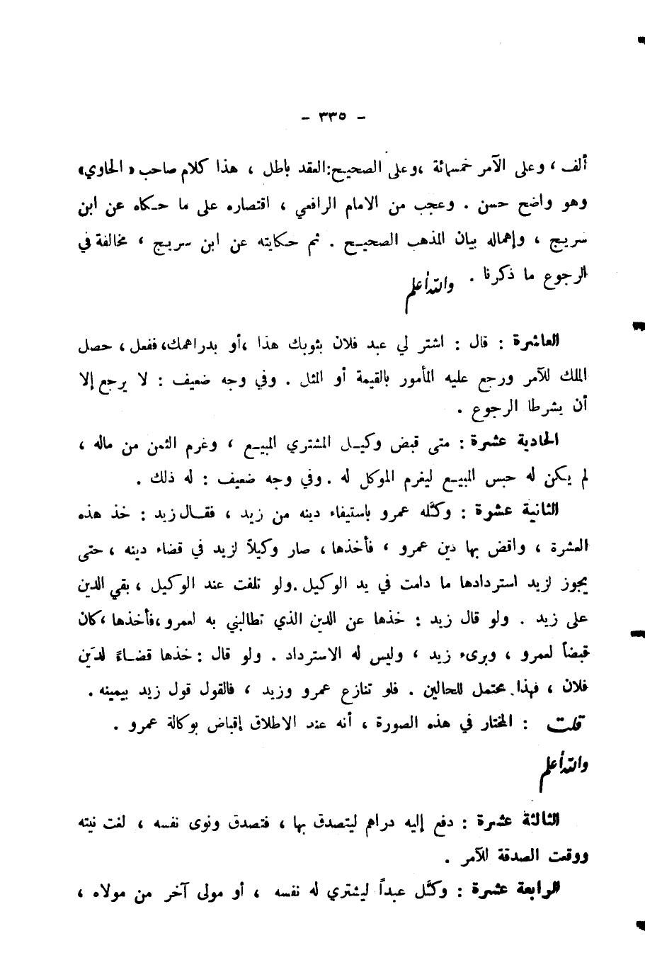 الرَّابِعَةَ عَشْرَةَ: وَكَّلَ عَبْدًا لِيَشْتَرِيَ لَهُ نَفْسَهُ، أَوْ مَوْلًى آخَرَ مِنْ مَوْلَاهُ،