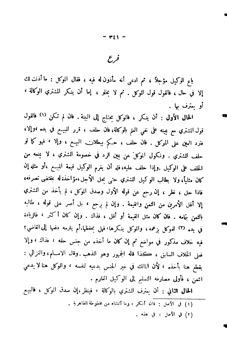 الْحَالُ الْأَوَّلُ: أَنْ يُنْكِرَ، فَالْمُوَكِّلُ يَحْتَاجُ إِلَى الْبَيِّنَةِ. فَإِنْ لَمْ تَكُنْ فَالْقَوْلُ قَوْلُ الْمُشْتَرِي مَعَ يَمِينِهِ عَلَى نَفْيِ الْعِلْمِ بِالْوَكَالَةِ، فَإِنْ حَلَفَ، قَرَّرَ الْمَبِيعَ فِي يَدِهِ، وَإِلَّا فَتُرَدُّ الْعَيْنُ عَلَى الْمُوَكِّلِ. فَإِنْ حَلَفَ، حُكِمَ بِبُطْلَانِ الْبَيْعِ، وَإِلَّا فَهُوَ كَمَا لَوْ حَلَفَ الْمُشْتَرِي. وَنُكُولُ الْمُوَكِّلِ عَنْ يَمِينِ الرَّدِّ فِي خُصُومَةِ الْمُشْتَرِي، لَا يَمْنَعُهُ مِنَ الْحَلِفِ عَلَى الْوَكِيلِ. وَإِذَا حَلَفَ عَلَيْهِ، فَلَهُ أَنْ يُغَرِّمَ الْوَكِيلَ قِيمَةَ الْمَبِيعِ، أَوْ مِثْلَهُ إِنْ كَانَ مِثْلِيًّا، وَلَا يُطَالِبُ الْوَكِيلُ الْمُشْتَرِي حَتَّى يَحِلَّ الْأَجَلُ، مُؤَاخَذَةً لَهُ بِمُقْتَضَى تَصَرُّفِهِ، فَإِذَا حَلَّ، نُظِرَ، إِنْ رَجَعَ عَنْ قَوْلِهِ الْأَوَّلِ وَصَدَّقَ الْمُوَكِّلُ، لَمْ يَأْخُذْ مِنَ الْمُشْتَرِي إِلَّا أَقَلَّ الْأَمْرَيْنِ مِنَ الثَّمَنِ وَالْقِيمَةِ. وَإِنْ لَمْ يَرْجِعْ، بَلْ أَصَرَّ عَلَى قَوْلِهِ، طَالَبَهُ بِالثَّمَنِ بِتَمَامِهِ. فَإِنْ كَانَ مِثْلَ الْقِيمَةِ أَوْ أَقَلَّ، فَذَاكَ. وَإِنْ كَانَ أَكْثَرَ، فَالزِّيَادَةُ فِي يَدِهِ لِلْمُوَكِّلِ بِزَعْمِهِ، وَالْمُوَكِّلُ يُنْكِرُهَا، فَهَلْ يَحْفَظُهَا أَمْ يَلْزَمُهُ دَفْعُهَا إِلَى الْقَاضِي؟ فِيهِ خِلَافٌ مَذْكُورٌ فِي مَوَاضِعَ، ثُمَّ إِنْ كَانَ مَا أَخَذَهُ مِنْ جِنْسِ حَقِّهِ، فَذَاكَ، وَإِلَّا فَعَلَى الْخِلَافِ السَّابِقِ، كَذَا قَالَهُ الْجُمْهُورُ وَهُوَ الْمَذْهَبُ. وَقَالَ الْإِمَامُ، وَالْغَزَالِيُّ: يَقْطَعُ هُنَا بِأَخْذِهِ؛ لِأَنَّ الْمَالِكَ فِي غَيْرِ الْجِنْسِ يَدَّعِيهِ لِنَفْسِهِ، وَالْمُوَكِّلُ هُنَا لَا يَدَّعِي الثَّمَنَ، فَأَوْلَى مَصَارِفِهِ التَّسْلِيمُ إِلَى الْوَكِيلِ الْغَارِمِ.