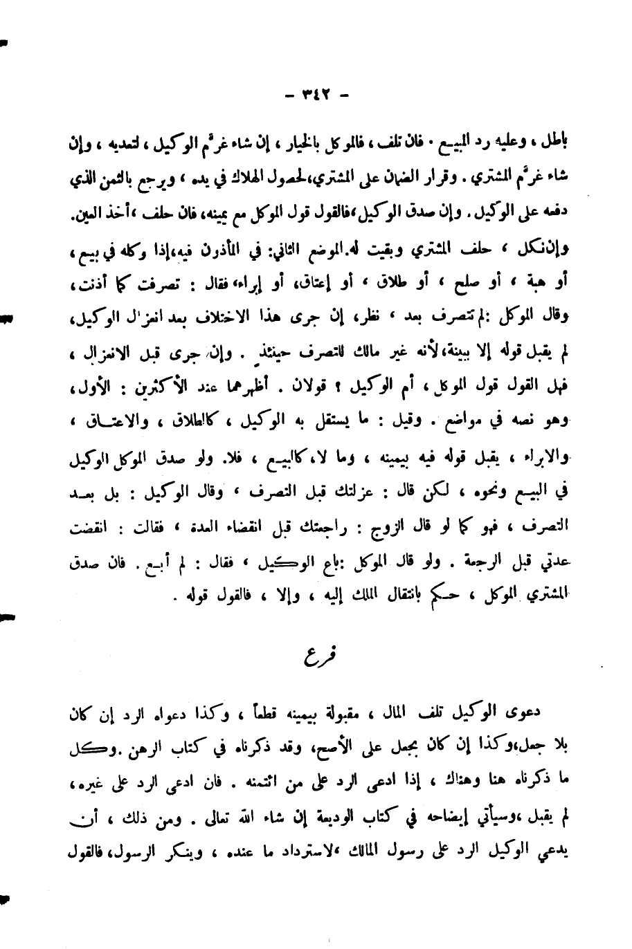 دَعْوَى الْوَكِيلِ تَلَفَ الْمَالِ، مَقْبُولَةٌ بِيَمِينِهِ قَطْعًا، وَكَذَا دَعْوَاهُ الرَّدَّ إِنْ كَانَ بِلَا جَعْلٍ، وَكَذَا إِنْ كَانَ بِجَعْلٍ عَلَى الْأَصَحِّ، وَقَدْ ذَكَرْنَاهُ فِي كِتَابِ الرَّهْنِ. وَكُلُّ مَا ذَكَّرْنَاهُ هُنَا وَهُنَاكَ، إِذَا ادَّعَى الرَّدَّ عَلَى مَنِ ائْتَمَنَهُ. فَإِنِ ادَّعَى الرَّدَّ عَلَى غَيْرِهِ، لَمْ يُقْبَلْ، وَسَيَأْتِي إِيضَاحُهُ فِي كِتَابِ الْوَدِيعَةِ إِنْ شَاءَ اللَّهُ تَعَالَى. وَمِنْ ذَلِكَ، أَنْ يَدَّعِيَ الْوَكِيلُ الرَّدَّ عَلَى رَسُولِ الْمَالِكِ، لِاسْتِرْدَادِ مَا عِنْدَهُ، وَيُنْكِرَ الرَّسُولُ، فَالْقَوْلُ