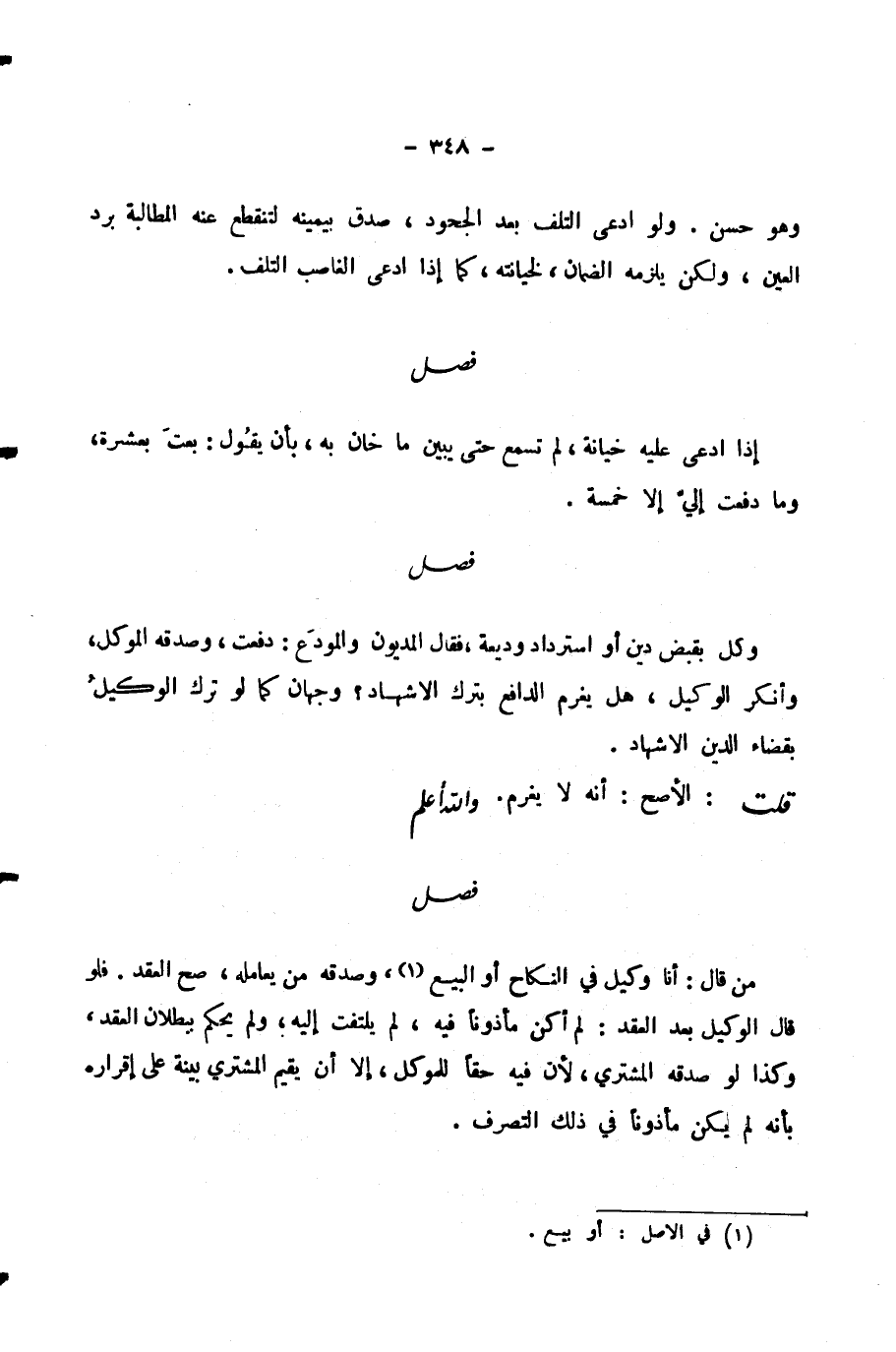 مَنْ قَالَ: أَنَا وَكِيلٌ فِي النِّكَاحِ أَوِ الْبَيْعِ، وَصَدَّقَهُ مَنْ يُعَامِلُهُ، صَحَّ الْعَقْدُ. فَلَوْ قَالَ الْوَكِيلُ بَعْدَ الْعَقْدِ: لَمْ أَكُنْ مَأْذُونًا فِيهِ، لَمْ يُلْتَفَتْ إِلَيْهِ، وَلَمْ يُحْكَمْ بِبُطْلَانِ الْعَقْدِ، وَكَذَا لَوْ صَدَّقَهُ الْمُشْتَرِي؛ لَأَنَّ فِيهِ حَقًّا لِلْمُوَكِّلِ، إِلَّا أَنْ يُقِيمَ الْمُشْتَرِي بَيِّنَةً عَلَى إِقْرَارِهِ بِأَنَّهُ لَمْ يَكُنْ مَأْذُونًا فِي ذَلِكَ التَّصَرُّفِ.