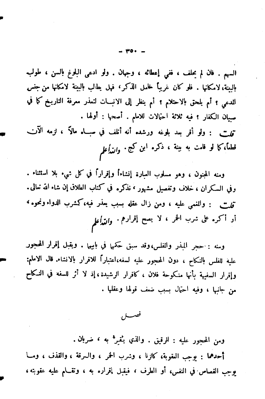 وَمِنْهُ الْمَجْنُونُ، وَهُوَ مَسْلُوبُ الْعِبَارَةِ إِنْشَاءً وَإِقْرَارًا فِي كُلِّ شَيْءٍ بِلَا اسْتِثْنَاءٍ. وَفِي السَّكْرَانِ خِلَافٌ وَتَفْصِيلٌ مَشْهُورٌ، نَذْكُرُهُ فِي كِتَابِ الطَّلَاقِ إِنْ شَاءَ اللَّهُ تَعَالَى.