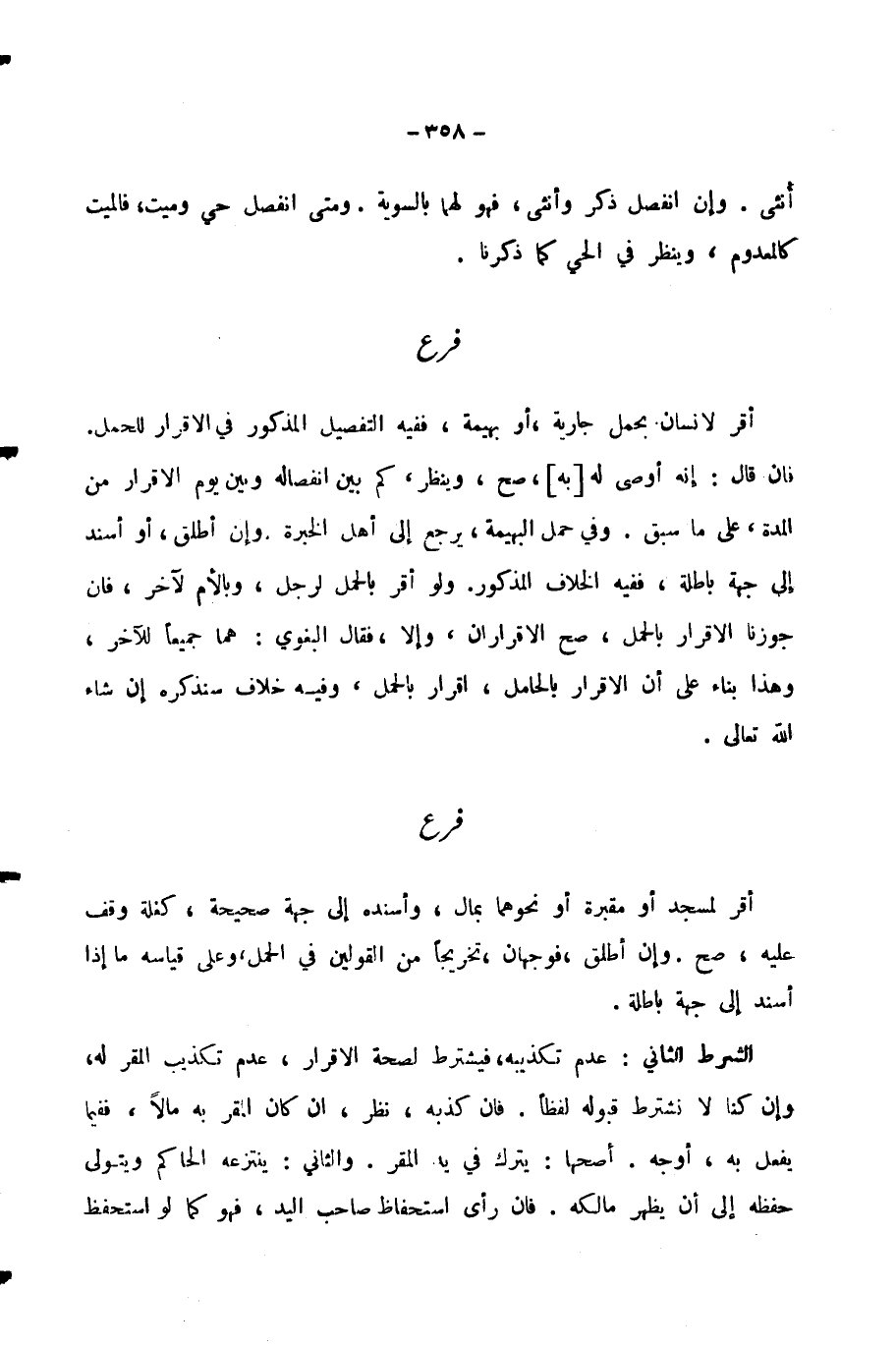 أَقَرَّ لِإِنْسَانٍ بِحَمْلِ جَارِيَةٍ، أَوْ بَهِيمَةٍ، فَفِيهِ التَّفْصِيلُ الْمَذْكُورُ فِي الْإِقْرَارِ لِلْحَمْلِ. فَإِنْ قَالَ: إِنَّهُ أَوْصَى لَهُ بِهِ صَحَّ، وَيُنْظَرُ، كَمْ بَيْنَ انْفِصَالِهِ وَبَيْنَ يَوْمِ الْإِقْرَارِ مِنَ الْمُدَّةِ، عَلَى مَا سَبَقَ. وَفِي حَمْلِ الْبَهِيمَةِ، يَرْجِعُ إِلَى أَهْلِ الْخِبْرَةِ. وَإِنْ أُطْلِقَ أَوْ أُسْنِدَ إِلَى جِهَةٍ بَاطِلَةٍ، فَفِيهِ الْخِلَافُ الْمَذْكُورُ. وَلَوْ أَقَرَّ بِالْحَمْلِ لِرَجُلٍ، وَبِالْأُمِّ لِآخَرَ، فَإِنْ جَوَّزْنَا الْإِقْرَارَ بِالْحَمْلِ، صَحَّ الْإِقْرَارَانِ، وَإِلَّا فَقَالَ الْبَغَوِيُّ: هُمَا جَمِيعًا لِلْآخَرِ، وَهَذَا بِنَاءٌ عَلَى أَنَّ الْإِقْرَارَ بِالْحَامِلِ إِقْرَارٌ بِالْحَمْلِ، وَفِيهِ خِلَافٌ سَنَذْكُرُهُ إِنْ شَاءَ اللَّهُ تَعَالَى.