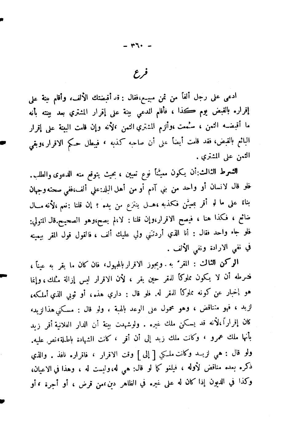 الشَّرْطُ الثَّالِثُ: أَنْ يَكُونَ مُعَيِّنًا نَوْعَ تَعْيِينٍ، بِحَيْثُ يُتَوَقَّعُ مِنْهُ الدَّعْوَى وَالطَّلَبُ. فَلَوْ قَالَ: لِإِنْسَانٍ أَوْ وَاحِدٍ مِنْ بَنِي آدَمَ أَوْ مِنْ أَهْلِ الْبَلَدِ عَلَيَّ أَلْفٌ، فَفِي صِحَّتِهِ وَجْهَانِ بِنَاءً عَلَى مَا لَوْ أَقَرَّ بِمُعَيَّنٍ فَكَذَّبَهُ، هَلْ يَنْتَزِعُ مِنْ يَدِهِ؟ إِنْ قُلْنَا: نَعَمْ؛ لِأَنَّهُ مَالٌ ضَائِعٌ، فَكَذَا هُنَا، فَيَصِحُّ الْإِقْرَارُ، وَإِنْ قُلْنَا: لَا، لَمْ يَصِحَّ، وَهُوَ الصَّحِيحُ. قَالَ الْمُتَوَلِّي: فَلَوْ جَاءَ وَاحِدٌ فَقَالَ: أَنَا الَّذِي أَرَدْتَنِي وَلِي عَلَيْكَ أَلْفٌ، فَالْقَوْلُ قَوْلُ الْمُقِرِّ بِيَمِينِهِ فِي نَفْيِ الْإِرَادَةِ وَنَفْيِ الْأَلْفِ.
