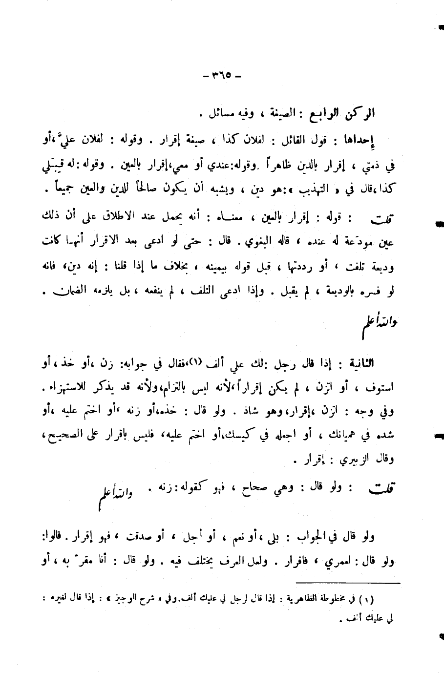 إِحْدَاهَا: قَوْلُ الْقَائِلِ: لِفُلَانٍ كَذَا، صِيغَةُ إِقْرَارٍ. وَقَوْلُهُ: لِفُلَانٍ عَلَيَّ، أَوْ فِي ذِمَّتِي، إِقْرَارٌ بِالدَّيْنِ ظَاهِرًا. وَقَوْلُهُ: عِنْدِي أَوْ مَعِي، إِقْرَارٌ بِالْعَيْنِ. وَقَوْلُهُ: لَهُ قِبَلِي كَذَا، قَالَ فِي «التَّهْذِيبِ» : هُوَ دَيْنٌ، وَيُشْبِهُ أَنْ يَكُونَ صَالِحًا لِلدَّيْنِ وَالْعَيْنِ جَمِيعًا.