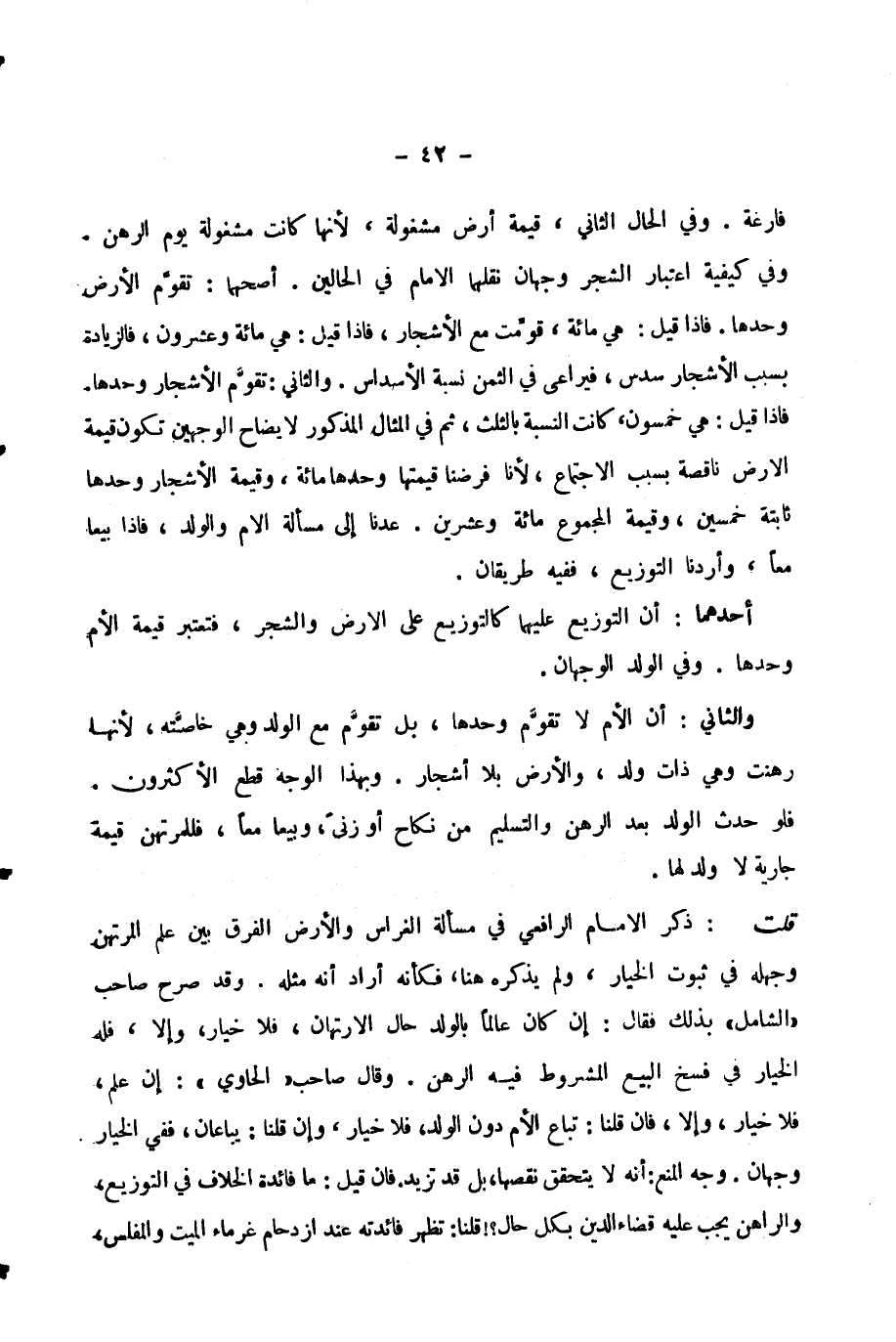 فَارِغَةً. وَفِي الْحَالِ الثَّانِي، قِيمَةُ أَرْضٍ مَشْغُولَةٍ؛ لِأَنَّهَا كَانَتْ مَشْغُولَةً يَوْمَ الرَّهْنِ. وَفِي كَيْفِيَّةِ اعْتِبَارِ الشَّجَرِ وَجْهَانِ نَقَلَهُمَا الْإِمَامُ فِي الْحَالَيْنِ. أَصَحُّهُمَا: تُقَوَّمُ الْأَرْضُ وَحْدَهَا. فَإِذَا قِيلَ: هِيَ مِائَةٌ، قُوِّمَتْ مَعَ الْأَشْجَارِ، فَإِذَا قِيلَ: هِيَ مِائَةٌ وَعِشْرُونَ، فَالزِّيَادَةُ بِسَبَبِ الْأَشْجَارِ سُدْسٌ، فَيُرَاعِي فِي الثَّمَنِ نِسْبَةُ الْأَسْدَاسِ. وَالثَّانِي: تُقَوَّمُ الْأَشْجَارُ وَحْدَهَا. فَإِذَا قِيلَ: هِيَ خَمْسُونَ، كَانَتِ النِّسْبَةُ بِالثُّلْثِ، ثُمَّ فِي الْمِثَالِ الْمَذْكُورِ لِإِيضَاحِ الْوَجْهَيْنِ تَكُونُ قِيمَةُ الْأَرْضِ نَاقِصَةً بِسَبَبِ الِاجْتِمَاعِ، لِأَنَّا فَرَضْنَا قِيمَتَهَا وَحْدَهَا مِائَةً، وَقِيمَةَ الْأَشْجَارِ وَحْدَهَا ثَابِتَةً خَمْسِينَ، وَقِيمَةَ الْمَجْمُوعِ مِائَةً وَعِشْرِينَ. عُدْنَا إِلَى مَسْأَلَةِ الْأُمِّ وَالْوَلَدِ، فَإِذَا بِيعَا مَعًا، وَأَرَدْنَا التَّوْزِيعَ، فَفِيهِ طَرِيقَانِ.