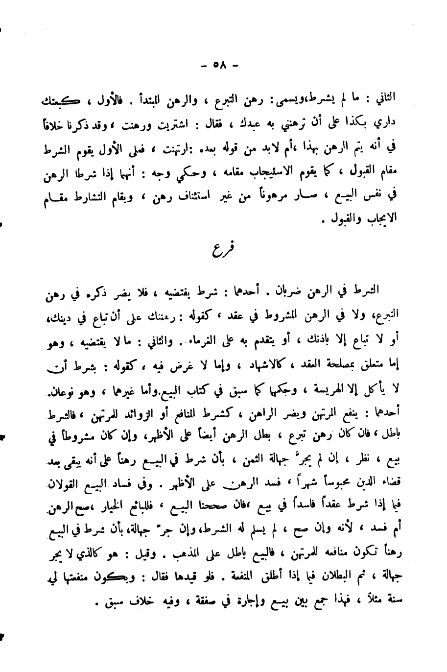 الشَّرْطُ فِي الرَّهْنِ ضَرْبَانِ. أَحَدُهُمَا: شَرْطٌ يَقْتَضِيهِ، فَلَا يَضُرُّ ذِكْرُهُ فِي رَهْنِ التَّبَرُّعِ، وَلَا فِي الرَّهْنِ الْمَشْرُوطِ فِي عَقْدٍ، كَقَوْلِهِ: رِهْنَتُكَ عَلَى أَنْ تُبَاعَ فِي دَيْنِكَ، أَوْ لَا تُبَاعَ إِلَّا بِإِذْنِكَ، أَوْ يَتَقَدَّمُ بِهِ عَلَى الْغُرَمَاءِ. وَالثَّانِي: مَا لَا يَقْتَضِيهِ، وَهُوَ إِمَّا مُتَعَلِّقٌ بِمَصْلَحَةِ الْعَقْدِ، كَالْإِشْهَادِ، وَإِمَّا لَا غَرَضَ فِيهِ، كَقَوْلِهِ: بِشَرْطِ أَنْ لَا يَأْكُلَ إِلَّا الْهَرِيسَةَ، وَحُكْمُهُمَا كَمَا سَبَقَ فِي كِتَابِ الْبَيْعِ. وَأَمَّا غَيْرُهُمَا، وَهُوَ نَوْعَانِ. أَحَدُهُمَا يَنْفَعُ الْمُرْتَهِنَ وَيَضُرُّ الرَّاهِنَ، كَشَرْطِ الْمَنَافِعِ أَوِ الزَّوَائِدِ لِلْمُرْتَهَنِ، فَالشَّرْطُ بَاطِلٌ، فَإِنْ كَانَ رَهْنَ تَبَرُّعٍ، بَطَلَ الرَّهْنُ أَيْضًا عَلَى الْأَظْهَرِ، وَإِنْ كَانَ مَشْرُوطًا فِي بَيْعٍ، نُظِرَ، إِنْ لَمْ يَجُرَّ جَهَالَةَ الثَّمَنِ، بِأَنْ شَرَطَ فِي الْبَيْعِ رَهْنًا عَلَى أَنَّهُ يَبْقَى بَعْدَ قَضَاءِ الدَّيْنِ مَحْبُوسًا شَهْرًا، فَسَدَ الرَّهْنُ عَلَى الْأَظْهَرِ. وَفِي فَسَادِ الْبَيْعِ الْقَوْلَانِ فِيمَا إِذَا شَرَطَ عَقْدًا فَاسِدًا فِي بَيْعٍ، فَإِنْ صَحَّحْنَا الْبَيْعَ، فَلِلْبَائِعِ الْخِيَارَ، صَحَّ الرَّهْنُ أَمْ فَسَدَ؛ لِأَنَّهُ وَإِنْ صَحَّ لَمْ يُسَلَّمْ لَهُ الشَّرْطُ، وَإِنْ جَرَّ جَهَالَةً، بِأَنَّ شَرَطَ فِي الْبَيْعِ رَهْنًا تَكُونُ مَنَافِعُهُ لِلْمُرْتَهَنِ، فَالْبَيْعُ بَاطِلٌ عَلَى الْمَذْهَبِ. وَقِيلَ: هُوَ الَّذِي لَا يَجُرُّ جَهَالَةً، ثُمَّ الْبُطْلَانُ فِيمَا إِذَا أَطْلَقَ الْمَنْفَعَةَ. فَلَوْ قَيَّدَهَا فَقَالَ: وَيَكُونُ مَنْفَعَتُهَا لِي سَنَةً مَثَلًا، فَهَذَا جَمْعٌ بَيْنَ بَيْعٍ وَإِجَارَةٍ فِي صَفْقَةٍ، وَفِيهِ خِلَافٌ سَبَقَ.