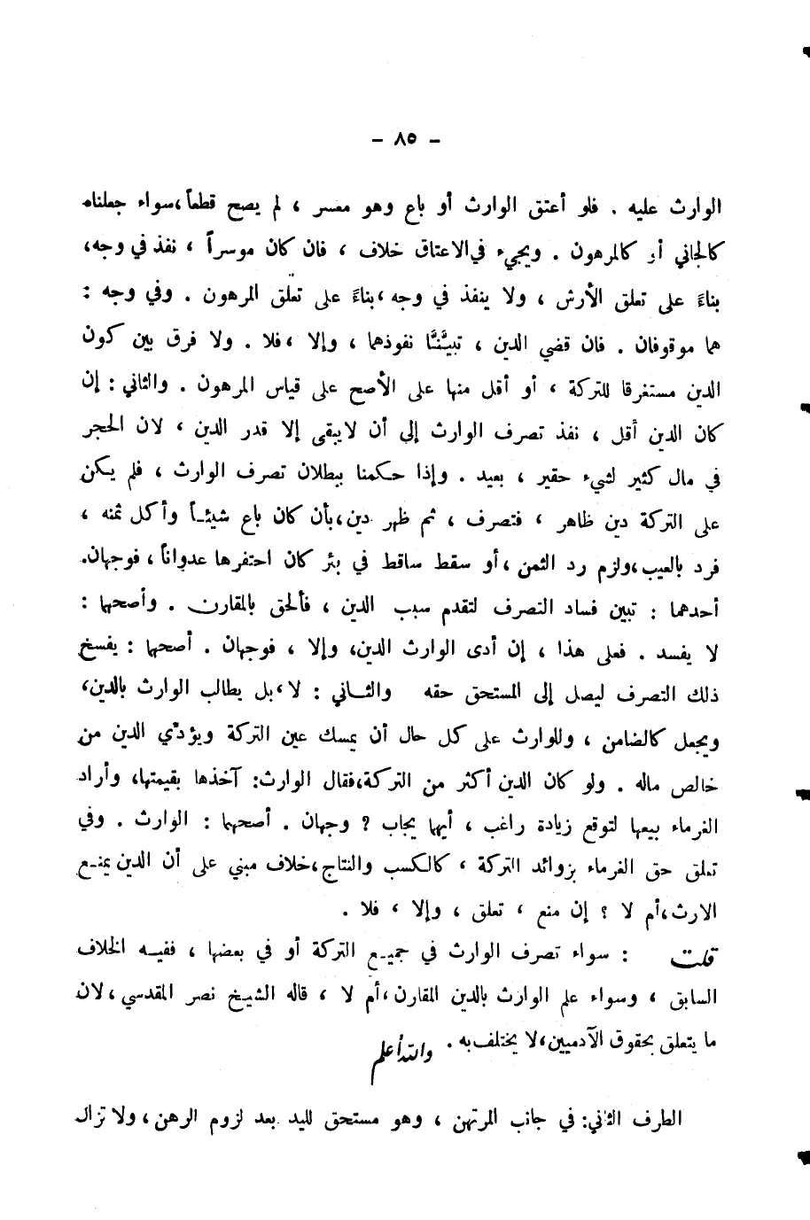 قُلْتُ: سَوَاءٌ تَصَرَّفَ الْوَارِثُ فِي جَمِيعِ التَّرِكَةِ أَوْ فِي بَعْضِهَا، فَفِيهِ الْخِلَافُ السَّابِقُ، وَسَوَاءٌ عَلِمَ الْوَارِثُ بِالدَّيْنِ الْمُقَارِنِ، أَمْ لَا، قَالَهُ الشَّيْخُ نَصْرٌ الْمَقْدِسِيُّ؛ لِأَنَّ مَا يَتَعَلَّقُ بِحُقُوقِ الْآدَمِيِّينَ، لَا يُخْتَلَفُ بِهِ. وَاللَّهُ أَعْلَمُ.