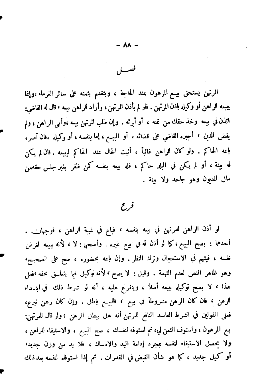 الْمُرْتَهِنُ يَسْتَحِقُّ بَيْعَ الْمَرْهُونِ عِنْدَ الْحَاجَةِ، وَيَتَقَدَّمُ بِثَمَنِهِ عَلَى سَائِرِ الْغُرَمَاءِ، وَإِنَّمَا يَبِيعُهُ أَوْ وَكِيلُهُ بِإِذْنِ الْمُرْتَهِنِ، فَلَوْ لَمْ يَأْذَنِ الْمُرْتَهِنُ، وَأَرَادَ الرَّاهِنُ بَيْعَهُ، قَالَ لَهُ الْقَاضِي: ائْذَنْ فِي بَيْعِهِ وَخُذْ حَقَّكَ مِنْ ثَمَنِهِ، أَوْ أَبْرِئْهُ. وَإِنْ طَلَبَ الْمُرْتَهِنُ بَيْعَهُ، وَأَبَى الرَّاهِنُ، وَلَمْ يَقْضِ الدَّيْنَ، أَجْبَرَهُ الْقَاضِي عَلَى قَضَائِهِ، أَوِ الْبَيْعِ، إِمَّا بِنَفْسِهِ، أَوْ وَكِيلِهِ، فَإِنْ أَصَرَّ، بَاعَهُ الْحَاكِمُ. وَلَوْ كَانَ الرَّاهِنُ غَائِبًا، أَثْبَتَ الْحَالَ عِنْدَ الْحَاكِمِ لِيَبِيعَهُ. فَإِنْ لَمْ يَكُنْ لَهُ بَيِّنَةٌ، أَوْ لَمْ يَكُنْ فِي الْبَلَدِ حَاكِمٌ، فَلَهُ بَيْعُهُ بِنَفْسِهِ كَمَنْ ظَفِرَ بِغَيْرِ جِنْسِ حَقِّهِ مِنْ مَالِ الْمَدْيُونِ وَهُوَ جَاحِدٌ وَلَا بَيِّنَةَ.
