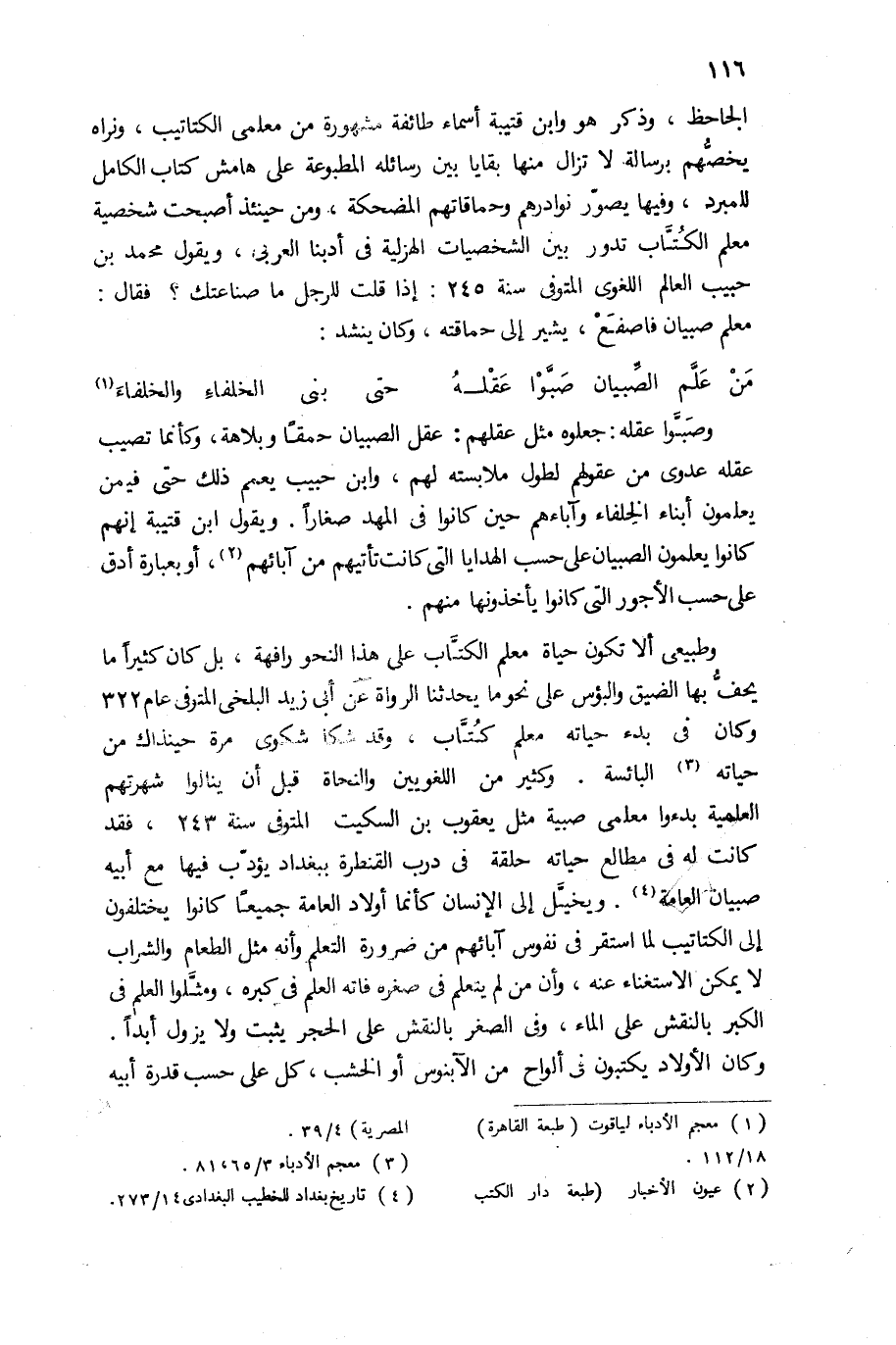 الجاحظ، وذكر هو وابن قتيبة أسماء طائفة مشهورة من معلمى الكتاتيب، ونراه يخصّهم برسالة لا تزال منها بقايا بين رسائله المطبوعة على هامش كتاب الكامل للمبرد، وفيها يصوّر نوادرهم وحماقاتهم المضحكة، ومن حينئذ أصبحت شخصية معلم الكتّاب تدور بين الشخصيات الهزلية فى أدبنا العربى، ويقول محمد بن حبيب العالم اللغوى المتوفى سنة 245: إذا قلت للرجل ما صناعتك؟ فقال:
