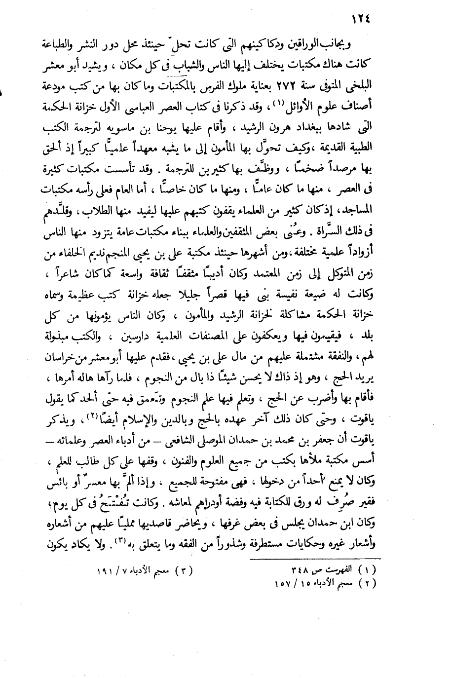 وبجانب الوراقين ودكاكينهم التى كانت تحلّ حينئذ محل دور النشر والطباعة كانت هناك مكتبات يختلف إليها الناس والشباب فى كل مكان، ويشيد أبو معشر البلخى المتوفى سنة 272 بعناية ملوك الفرس بالمكتبات وما كان بها من كتب مودعة أصناف علوم الأوائل (¬1)، وقد ذكرنا فى كتاب العصر العباسى الأول خزانة الحكمة التى شادها ببغداد هرون الرشيد، وأقام عليها يوحنا بن ماسويه لترجمة الكتب الطبية القديمة، وكيف تحوّل بها المأمون إلى ما يشبه معهدا علميّا كبيرا إذ ألحق بها مرصدا ضخما، ووظّف بها كثيرين للترجمة. وقد تأسست مكتبات كثيرة فى العصر، منها ما كان عامّا، ومنها ما كان خاصّا، أما العام فعلى رأسه مكتبات المساجد، إذ كان كثير من العلماء يقفون كتبهم عليها ليفيد منها الطلاب، وقلّدهم فى ذلك السّراة. وعنى بعض المثقفين والعلماء ببناء مكتبات عامة يتزود منها الناس أزوادا علمية مختلفة، ومن أشهرها حينئذ مكتبة على بن يحيى المنجم نديم الخلفاء من زمن المتوكل إلى زمن المعتمد وكان أديبا مثقفا ثقافة واسعة كما كان شاعرا، وكانت له ضيعة نفيسة بنى فيها قصرا جليلا جعله خزانة كتب عظيمة وسماه خزانة الحكمة متشاكلة لخزانة الرشيد والمأمون، وكان الناس يؤمونها من كل بلد، فيقيمون فيها ويعكفون على المصنفات العلمية دارسين، والكتب مبذولة لهم، والنفقة مشتملة عليهم من مال على بن يحيى، فقدم عليها أبو معشر من خراسان يريد الحج، وهو إذ ذاك لا يحسن شيئا ذا بال من النجوم، فلما رآها هاله أمرها، فأقام بها وأضرب عن الحج، وتعلم فيها علم النجوم وتعمق فيه حتى ألحد كما يقول ياقوت، وحتى كان ذلك آخر عهده بالحج وبالدين والإسلام أيضا (¬2)، ويذكر ياقوت أن جعفر بن محمد بن حمدان الموصلى الشافعى-من أدباء العصر وعلمائه- أسس مكتبة ملأها بكتب من جميع العلوم والفنون، وقفها على كل طالب للعلم، وكان لا يمنع أحدا من دخولها، فهى مفتوحة للجميع، وإذا ألمّ بها معسر أو بائس فقير صرف له ورق للكتابة فيه وفضة أو دراهم لمعاشه. وكانت تفتح فى كل يوم، وكان ابن حمدان يجلس فى بعض غرفها، ويحاضر قاصديها ممليا عليهم من أشعاره وأشعار غيره وحكايات مستطرفة وشذورا من الفقه وما يتعلق به (¬3). ولا يكاد يكون