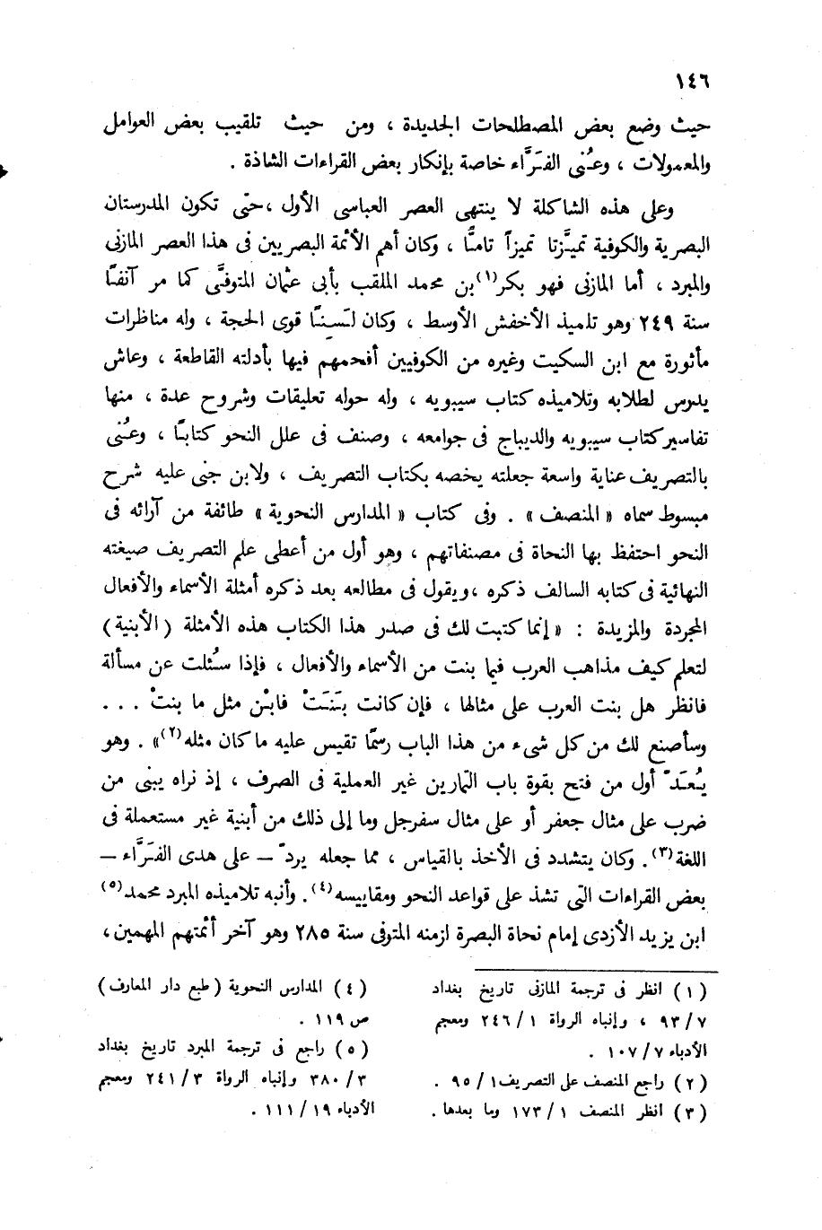 وعلى هذه الشاكلة لا ينتهى العصر العباسى الأول، حتى تكون المدرستان البصرية والكوفية تميّزتا تميزا تامّا، وكان أهم الأئمة البصريين فى هذا العصر المازنى والمبرد، أما المازنى فهو بكر (¬1) بن محمد الملقب بأبى عثمان المتوفّى كما مر آنفا سنة 249 وهو تلميذ الأخفش الأوسط، وكان لسنا قوى الحجة، وله مناظرات مأثورة مع ابن السكيت وغيره من الكوفيين أفحمهم فيها بأدلته القاطعة، وعاش يدرس لطلابه وتلاميذه كتاب سيبويه، وله حوله تعليقات وشروح عدة، منها تفاسير كتاب سيبويه والديباج فى جوامعه، وصنف فى علل النحو كتابا، وعنى بالتصريف عناية واسعة جعلته يخصه بكتاب التصريف، ولابن جنى عليه شرح مبسوط سماه «المنصف». وفى كتاب «المدارس النحوية» طائفة من آرائه فى النحو احتفظ بها النحاة فى مصنفاتهم، وهو أول من أعطى علم التصريف صيغته النهائية فى كتابه السالف ذكره، ويقول فى مطالعه بعد ذكره أمثلة الأسماء والأفعال المجردة والمزيدة: «إنما كتبت لك فى صدر هذا الكتاب هذه الأمثلة (الأبنية) لتعلم كيف مذاهب العرب فيما بنت من الأسماء والأفعال، فإذا سئلت عن مسألة فانظر هل بنت العرب على مثالها، فإن كانت بنت فابن مثل ما بنت. . .