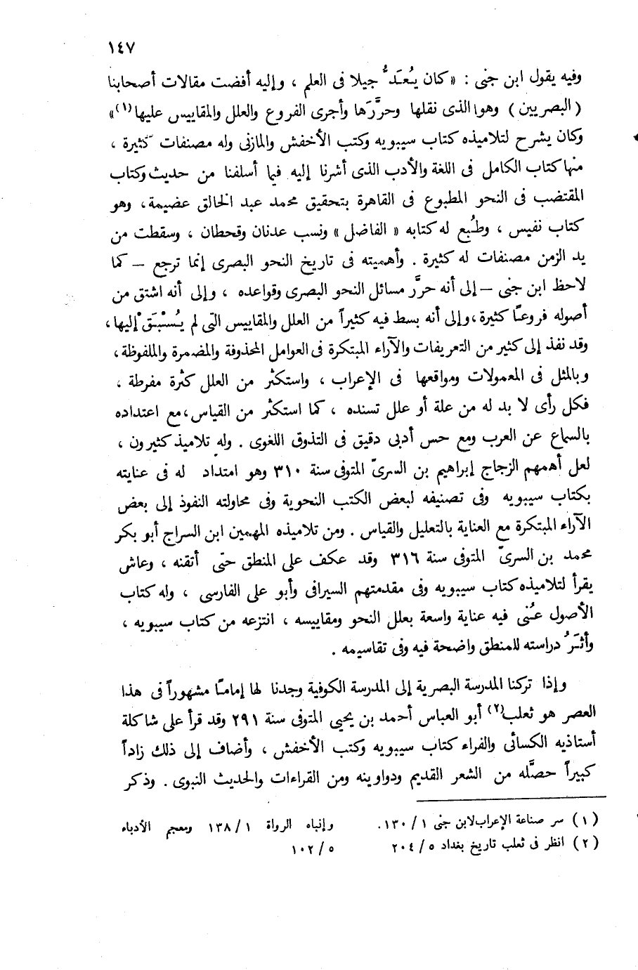 وإذا تركنا المدرسة البصرية إلى المدرسة الكوفية وجدنا لها إماما مشهورا فى هذا العصر هو ثعلب (¬2) أبو العباس أحمد بن يحيى المتوفى سنة 291 وقد قرأ على شاكلة أستاذيه الكسائى والفراء كتاب سيبويه وكتب الأخفش، وأضاف إلى ذلك زادا كبيرا حصّله من الشعر القديم ودواوينه ومن القراءات والحديث النبوى. وذكر