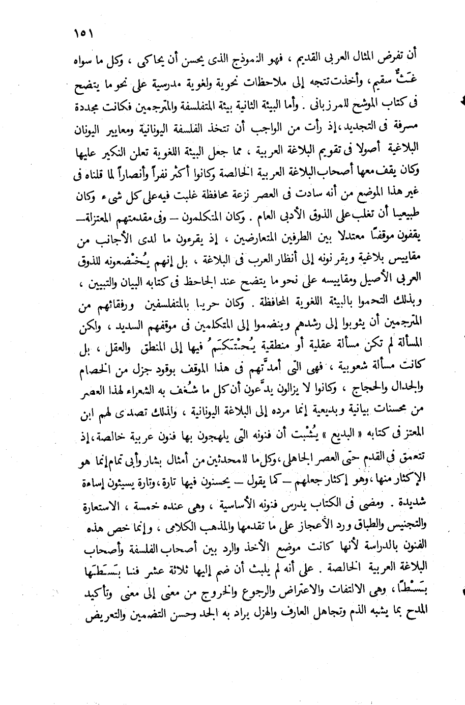 أن تفرض المثال العربىّ القديم، فهو النموذج الذى يحسن أن يحاكى، وكل ما سواه غثّ سقيم، وأخذت تتجه إلى ملاحظات نحوية ولغوية مدرسية على نحو ما يتضح فى كتاب الموشح للمرزبانى. وأما البيئة الثانية بيئة المتفلسفة والمترجمين فكانت مجددة مسرفة فى التجديد، إذ رأت من الواجب أن تتخذ الفلسفة اليونانية ومعايير اليونان البلاغية أصولا فى تقويم البلاغة العربية، مما جعل البيئة اللغوية تعلن النكير عليها وكان يقف معها أصحاب البلاغة العربية الخالصة وكانوا أكثر نفرا وأنصارا لما قلناه فى غير هذا الموضع من أنه سادت فى العصر نزعة محافظة غلبت فيه على كل شئ وكان طبيعيا أن تغلب على الذوق الأدبى العام. وكان المتكلمون-وفى مقدمتهم المعتزلة- يقفون موقفا معتدلا بين الطرفين المتعارضين، إذ يقرءون ما لدى الأجانب من مقاييس بلاغية ويقرنونه إلى أنظار العرب فى البلاغة، بل إنهم يخضعونه للذوق العربى الأصيل ومقاييسه على نحو ما يتضح عند الجاحظ فى كتابه البيان والتبيين، وبذلك التحموا بالبيئة اللغوية المحافظة. وكان حريا بالمتفلسفين ورفقائهم من المترجمين أن يثوبوا إلى رشدهم وينضموا إلى المتكلمين فى موقفهم السديد، ولكن المسألة لم تكن مسألة عقلية أو منطقية يحتكم فيها إلى المنطق والعقل، بل كانت مسألة شعوبية، فهى التى أمدّتهم فى هذا الموقف بوقود جزل من الخصام والجدال والحجاج، وكانوا لا يزالون يدّعون أن كل ما شغف به الشعراء لهذا العصر من محسنات بيانية وبديعية إنما مرده إلى البلاغة اليونانية، ولذلك تصدى لهم ابن المعتز فى كتابه «البديع» يثبت أن فنونه التى يلهجون بها فنون عربية خالصة، إذ تتعمق فى القدم حتى العصر الجاهلى، وكل ما لا محدثين من أمثال بشار وأبى تمام إنما هو الإكثار منها، وهو إكثار جعلهم-كما يقول-يحسنون فيها تارة، وتارة يسيئون إساءة شديدة. ومضى فى الكتاب يدرس فنونه الأساسية، وهى عنده خمسة، الاستعارة والتجنيس والطباق ورد الأعجاز على ما تقدمها والمذهب الكلامى، وإنما خص هذه الفنون بالدراسة لأنها كانت موضع الأخذ والرد بين أصحاب الفلسفة وأصحاب البلاغة العربية الخالصة. على أنه لم يلبث أن ضم إليها ثلاثة عشر فنا بسطها بسطا، وهى الالتفات والاعتراض والرجوع والخروج من معنى إلى معنى وتأكيد المدح بما يشبه الذم وتجاهل العارف والهزل يراد به الجد وحسن التضمين والتعريض