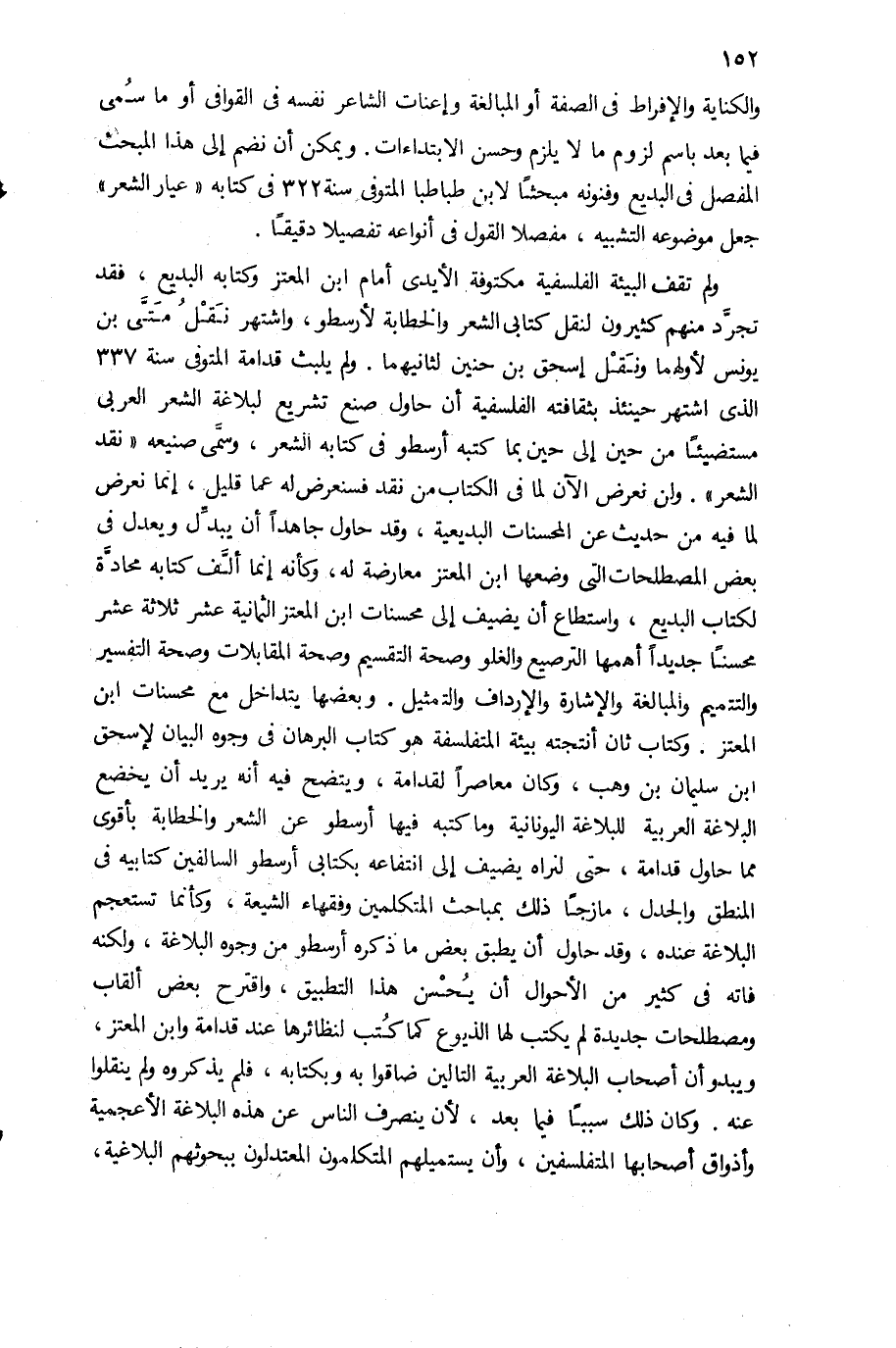 ولم تقف البيئة الفلسفية مكتوفة الأيدى أمام ابن المعتز وكتابه البديع، فقد تجرّد منهم كثيرون لنقل كتابى الشعر والخطابة لأرسطو، واشتهر نقل متّى بن يونس لأولهما ونقل إسحق بن حنين لثانيهما. ولم يلبث قدامة المتوفى سنة 337 الذى اشتهر حينئذ بثقافته الفلسفية أن حاول صنع تشريع لبلاغة الشعر العربى مستضيئا من حين إلى حين بما كتبه أرسطو فى كتابه الشعر، وسمّى صنيعه «نقد الشعر». ولن نعرض الآن لما فى الكتاب من نقد فسنعرض له عما قليل، إنما نعرض لما فيه من حديث عن المحسنات البديعية، وقد حاول جاهدا أن يبدّل ويعدل فى بعض المصطلحات التى وضعها ابن المعتز معارضة له، وكأنه إنما ألّف كتابه محادّة لكتاب البديع، واستطاع أن يضيف إلى محسنات ابن المعتز الثمانية عشر ثلاثة عشر محسنا جديدا أهمها الترصيع والغلو وصحة التقسيم وصحة المقابلات وصحة التفسير والتتميم والمبالغة والإشارة والإرداف والتمثيل. وبعضها يتداخل مع محسنات ابن المعتز. وكتاب ثان أنتجته بيئة المتفلسفة هو كتاب البرهان فى وجوه البيان لإسحق ابن سليمان بن وهب، وكان معاصرا لقدامة، ويتضح فيه أنه يريد أن يخضع البلاغة العربية للبلاغة اليونانية وما كتبه فيها أرسطو عن الشعر والخطابة بأقوى مما حاول قدامة، حتى لنراه يضيف إلى انتفاعه بكتابى أرسطو السالفين كتابيه فى المنطق والجدل، مازجا ذلك بمباحث المتكلمين وفقهاء الشيعة، وكأنما تستعجم البلاغة عنده، وقد حاول أن يطبق بعض ما ذكره أرسطو من وجوه البلاغة، ولكنه فاته فى كثير من الأحوال أن يحسن هذا التطبيق، واقترح بعض ألقاب ومصطلحات جديدة لم يكتب لها الذيوع كما كتب لنظائرها عند قدامة وابن المعتز، ويبدو أن أصحاب البلاغة العربية التالين ضاقوا به وبكتابه، فلم يذكروه ولم ينقلوا عنه. وكان ذلك سببا فيما بعد، لأن ينصرف الناس عن هذه البلاغة الأعجمية وأذواق أصحابها المتفلسفين، وأن يستميلهم المتكلمون المعتدلون ببحوثهم البلاغية،
