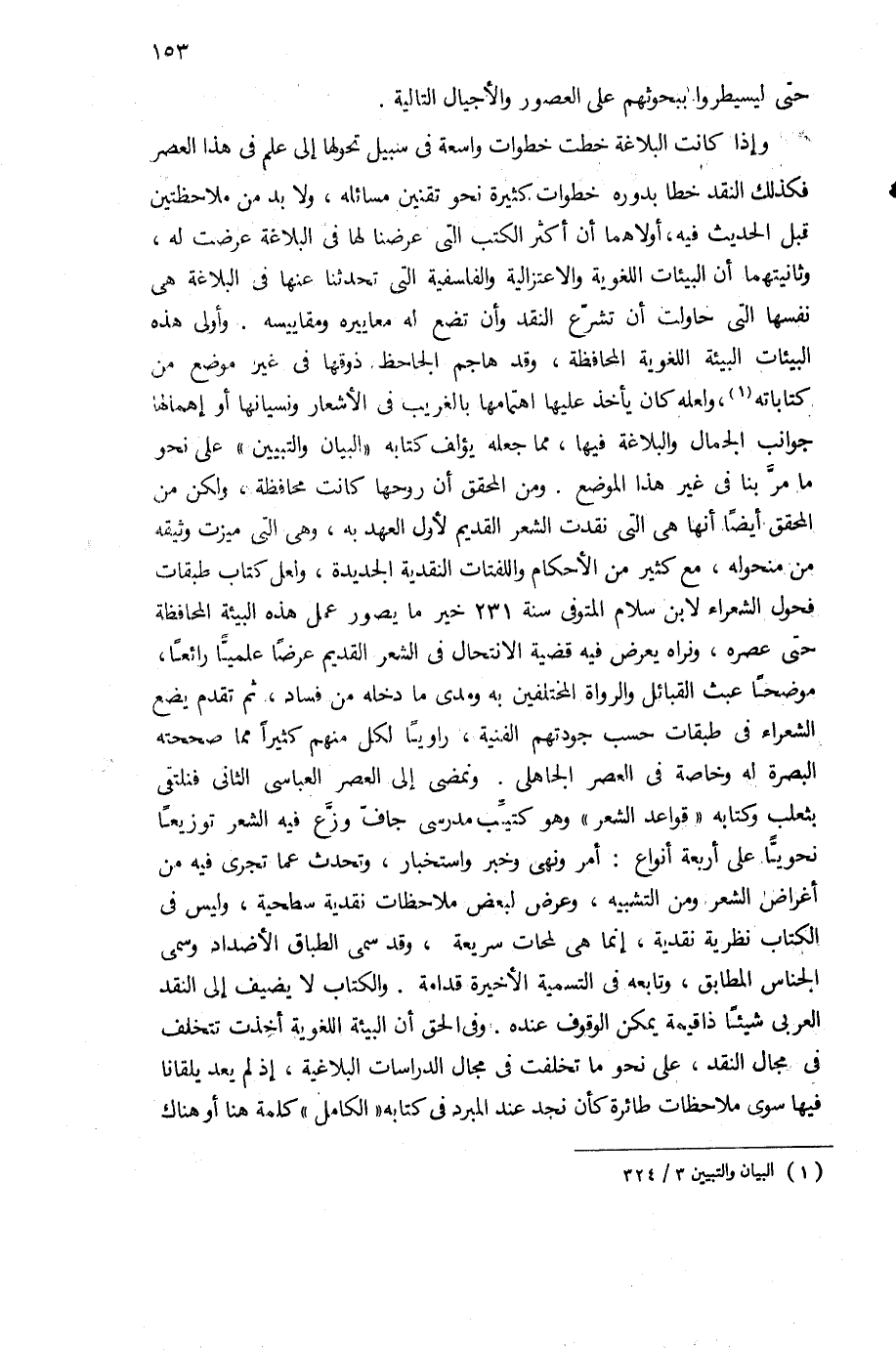 وإذا كانت البلاغة خطت خطوات واسعة فى سبيل تحولها إلى علم فى هذا العصر فكذلك النقد خطا بدوره خطوات كثيرة نحو تقنين مسائله، ولا بد من ملاحظتين قبل الحديث فيه، أولاهما أن أكثر الكتب التى عرضنا لها فى البلاغة عرضت له، وثانيتهما أن البيئات اللغوية والاعتزالية والفلسفية التى تحدثنا عنها فى البلاغة هى نفسها التى حاولت أن تشرّع النقد وأن تضع له معاييره ومقاييسه. وأولى هذه البيئات البيئة اللغوية المحافظة، وقد هاجم الجاحظ ذوقها فى غير موضع من كتاباته (¬1)، ولعله كان يأخذ عليها اهتمامها بالغريب فى الأشعار ونسيانها أو إهمالها جوانب الجمال والبلاغة فيها، مما جعله يؤلف كتابه «البيان والتبيين» على نحو ما مرّ بنا فى غير هذا الموضع. ومن المحقق أن روحها كانت محافظة، ولكن من المحقق أيضا أنها هى التى نقدت الشعر القديم لأول العهد به، وهى التى ميزت وثيقه من منحوله، مع كثير من الأحكام واللفتات النقدية الجديدة، ولعل كتاب طبقات فحول الشعراء لابن سلام المتوفى سنة 231 خير ما يصور عمل هذه البيئة المحافظة حتى عصره، ونراه يعرض فيه قضية الانتحال فى الشعر القديم عرضا علميّا رائعا، موضحا عبث القبائل والرواة المختلفين به ومدى ما دخله من فساد، ثم تقدم يضع الشعراء فى طبقات حسب جودتهم الفنية، راويا لكل منهم كثيرا مما صححته البصرة له وخاصة فى العصر الجاهلى. ونمضى إلى العصر العباسى الثانى فنلتقى بثعلب وكتابه «قواعد الشعر» وهو كتيّب مدرسى جافّ وزّع فيه الشعر توزيعا نحويّا على أربعة أنواع: أمر ونهى وخبر واستخبار، وتحدث عما تجرى فيه من أغراض الشعر ومن التشبيه، وعرض لبعض ملاحظات نقدية سطحية، وليس فى الكتاب نظرية نقدية، إنما هى لمحات سريعة، وقد سمى الطباق الأضداد وسمى الجناس المطابق، وتابعه فى التسمية الأخيرة قدامة. والكتاب لا يضيف إلى النقد العربى شيئا ذا قيمة يمكن الوقوف عنده. وفى الحق أن البيئة اللغوية أخذت تتخلف فى مجال النقد، على نحو ما تخلفت فى مجال الدراسات البلاغية، إذ لم يعد يلقانا فيها سوى ملاحظات طائرة كأن نجد عند المبرد فى كتابه «الكامل» كلمة هنا أو هناك