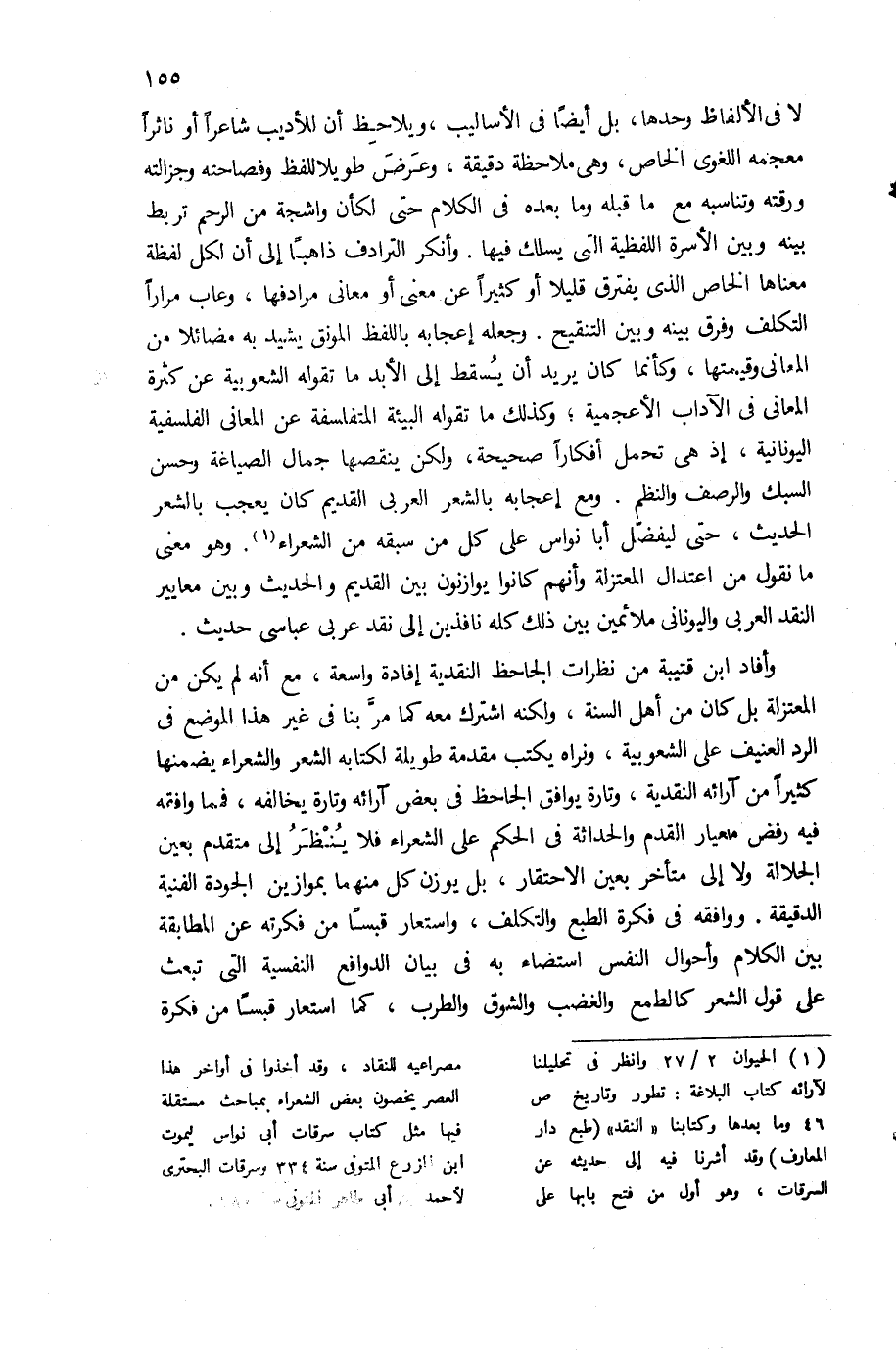 (¬1) الحيوان 2/ 27 وانظر فى تحليلنا لآرائه كتاب البلاغة: تطور وتاريخ ص 46 وما بعدها وكتابنا «النقد» (طبع دار المعارف) وقد أشرنا فيه إلى حديثه عن السرقات، وهو أول من فتح بابها على مصراعيه للنقاد، وقد أخذوا فى أواخر هذا العصر يخصون بعض الشعراء بمباحث مستقلة فيها مثل كتاب سرقات أبى نواس ليموت ابن المزرع المتوفى سنة 334 وسرقات البحترى لأحمد بن أبى طاهر المتوفى سنة 280.