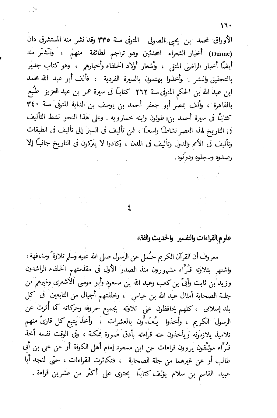 الأوراق لمحمد بن يحيى الصولى المتوفى سنة 335 وقد نشر منه المستشرق دان (DUNNe) أخبار الشعراء المحدثين وهو تراجم لطائفة منهم، ونشر منه أيضا أخبار الراضى المتقى، وأشعار أولاد الخلفاء وأخبارهم، وهو كتاب جدير بالتحقيق والنشر. وأخذوا يهتمون بالسيرة الفردية، فألف أبو عبد الله محمد ابن عبد الله بن الحكم المتوفى سنة 262 كتابا فى سيرة عمر بن عبد العزيز طبع بالقاهرة، وألف بمصر أبو جعفر أحمد بن يوسف بن الداية المتوفى سنة 340 كتابا فى سيرة أحمد بن طولون وابنه خمارويه. وعلى هذا النحو نشط التأليف فى التاريخ لهذا العصر نشاطا واسعا، فمن تأليف فى السير إلى تأليف فى الطبقات وتأليف فى الأمم والدول وتأليف فى المدن، وكادوا لا يتركون فى التاريخ جانبا إلا رصدوه وسجلوه ودوّنوه.
