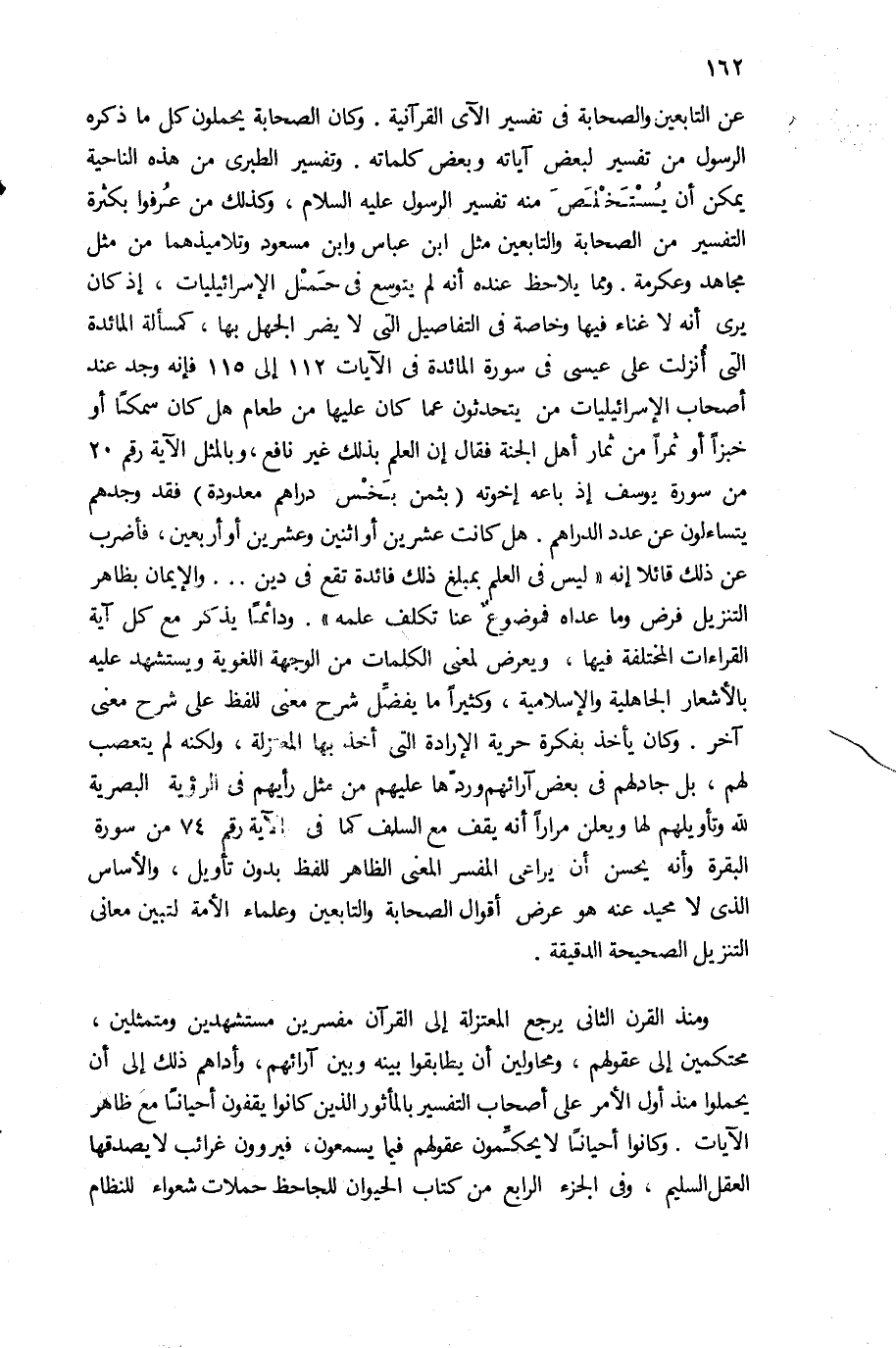 ومنذ القرن الثانى يرجع المعتزلة إلى القرآن مفسرين مستشهدين ومتمثلين، محتكمين إلى عقولهم، ومحاولين أن يطابقوا بينه وبين آرائهم، وأداهم ذلك إلى أن يحملوا منذ أول الأمر على أصحاب التفسير بالمأثور الذين كانوا يقفون أحيانا مع ظاهر الآيات. وكانوا أحيانا لا يحكّمون عقولهم فيما يسمعون، فيروون غرائب لا يصدقها العقل السليم، وفى الجزء الرابع من كتاب الحيوان للجاحظ حملات شعواء للنظام