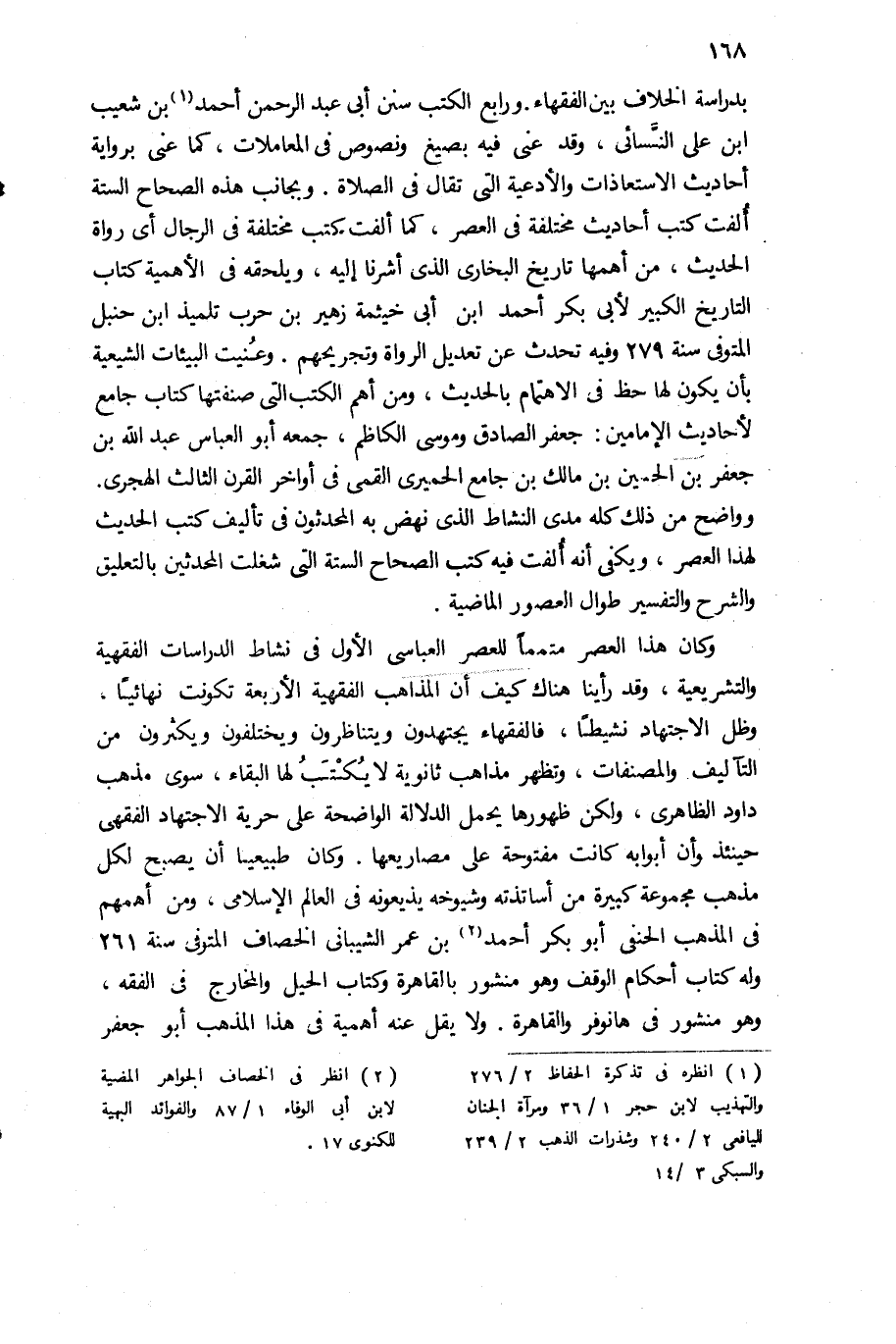 بدراسة الخلاف بين الفقهاء. ورابع الكتب سنن أبى عبد الرحمن أحمد (¬1) بن شعيب ابن على النّسائى، وقد عنى فيه بصيغ ونصوص فى المعاملات، كما عنى برواية أحاديث الاستعاذات والأدعية التى تقال فى الصلاة. وبجانب هذه الصحاح الستة ألفت كتب أحاديث مختلفة فى العصر، كما ألفت كتب مختلفة فى الرجال أى رواة الحديث، من أهمها تاريخ البخارى الذى أشرنا إليه، ويلحقه فى الأهمية كتاب التاريخ الكبير لأبى بكر أحمد ابن أبى خيثمة زهير بن حرب تلميذ ابن حنبل المتوفى سنة 279 وفيه تحدث عن تعديل الرواة وتجريحهم. وعنيت البيئات الشيعية بأن يكون لها حظ فى الاهتمام بالحديث، ومن أهم الكتب التى صنفتها كتاب جامع لأحاديث الإمامين: جعفر الصادق وموسى الكاظم، جمعه أبو العباس عبد الله بن جعفر بن الحسين بن مالك بن جامع الحميرى القمى فى أواخر القرن الثالث الهجرى.