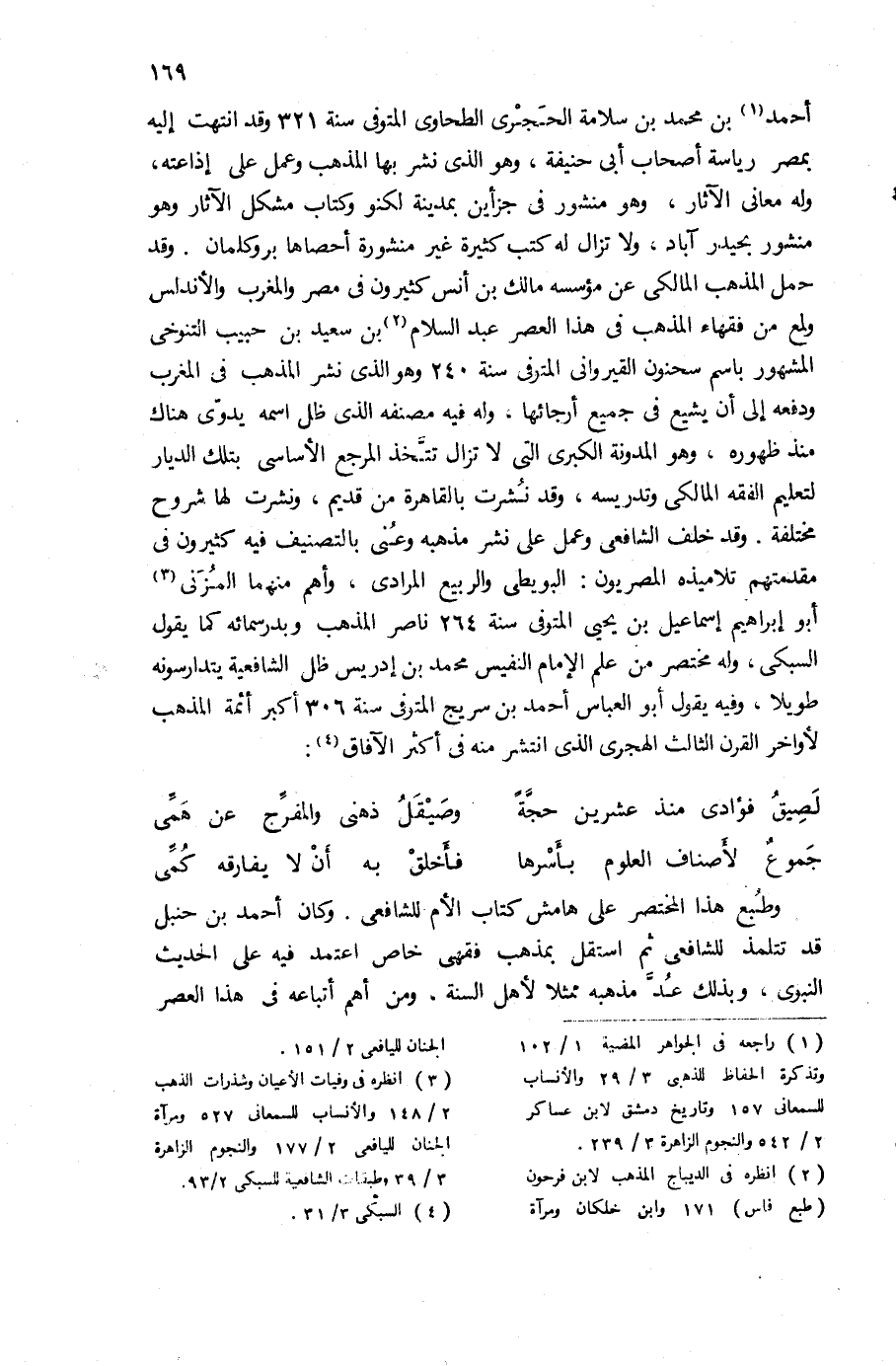 أحمد (¬1) بن محمد بن سلامة الحجرى الطحاوى المتوفى سنة 321 وقد انتهت إليه بمصر رياسة أصحاب أبى حنيفة، وهو الذى نشر بها المذهب وعمل على إذاعته، وله معانى الآثار، وهو منشور فى جزأين بمدينة لكنو وكتاب مشكل الآثار وهو منشور بحيدرآباد، ولا تزال له كتب كثيرة غير منشورة أحصاها بروكلمان. وقد حمل المذهب المالكى عن مؤسسه مالك بن أنس كثيرون فى مصر والمغرب والأندلس ولمع من فقهاء المذهب فى هذا العصر عبد السلام (¬2) بن سعيد بن حبيب التنوخى المشهور باسم سحنون القيروانى المتوفى سنة 240 وهو الذى نشر المذهب فى المغرب ودفعه إلى أن يشيع فى جميع أرجائها، وله فيه مصنفه الذى ظل اسمه يدوّى هناك منذ ظهوره، وهو المدونة الكبرى التى لا تزال تتّخذ المرجع الأساسى بتلك الديار لتعليم الفقه المالكى وتدريسه، وقد نشرت بالقاهرة من قديم، ونشرت لها شروح مختلفة. وقد خلف الشافعى وعمل على نشر مذهبه وعنى بالتصنيف فيه كثيرون فى مقدمتهم تلاميذه المصريون: البويطى والربيع المرادى، وأهم منهما المزنى (¬3) أبو إبراهيم إسماعيل بن يحيى المتوفى سنة 264 ناصر المذهب وبدرسمائه كما يقول السبكى، وله مختصر من علم الإمام النفيس محمد بن إدريس ظل الشافعية يتدارسونه طويلا، وفيه يقول أبو العباس أحمد بن سريج المتوفى سنة 306 أكبر أئمة المذهب لأواخر القرن الثالث الهجرى الذى انتشر منه فى أكثر الآفاق (¬4):