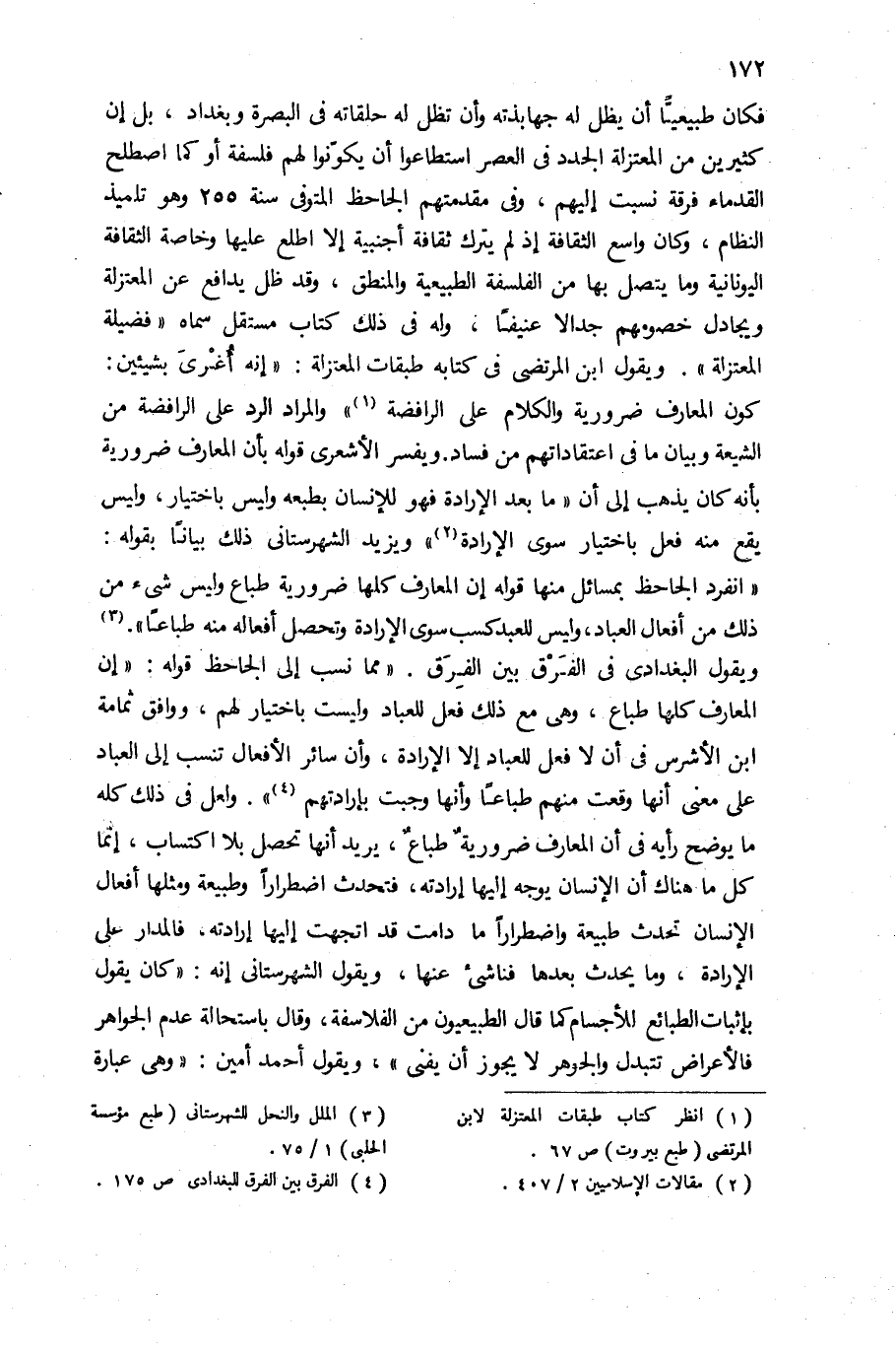 «انفرد الجاحظ بمسائل منها قوله إن المعارف كلها ضرورية طباع وليس شئ من ذلك من أفعال العباد، وليس للعبد كسب سوى الإرادة وتحصل أفعاله منه طباعا». (¬3)