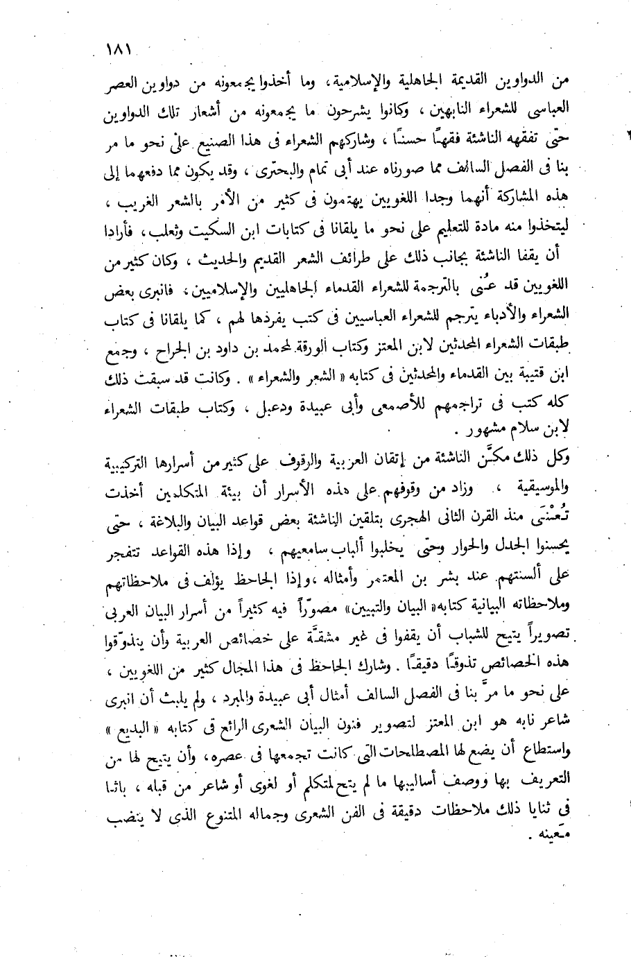 وكل ذلك مكّن الناشئة من إتقان العربية والوقوف على كثير من أسرارها التركيبية والموسيقية، وزاد من وقوفهم على هذه الأسرار أن بيئة المتكلمين أخذت تعنى منذ القرن الثانى الهجرى بتلقين الناشئة بعض قواعد البيان والبلاغة، حتى يحسنوا الجدل والحوار وحتى يخلبوا ألباب سامعيهم، وإذا هذه القواعد تتفجر على ألسنتهم عند بشر بن المعتمر وأمثاله، وإذا الجاحظ يؤلف فى ملاحظاتهم وملاحظاته البيانية كتابه «البيان والتبيين» مصوّرا فيه كثيرا من أسرار البيان العربى تصويرا يتيح للشباب أن يقفوا فى غير مشقّة على خصائص العربية وأن يتذوّقوا هذه الخصائص تذوقا دقيقا. وشارك الجاحظ فى هذا المجال كثير من اللغويين، على نحو ما مرّ بنا فى الفصل السالف أمثال أبى عبيدة والمبرد، ولم يلبث أن انبرى شاعر نابه هو ابن المعتز لتصوير فنون البيان الشعرى الرائع فى كتابه «البديع» واستطاع أن يضع لها المصطلحات التى كانت تجمعها فى عصره، وأن يتيح لها من التعريف بها ووصف أساليبها ما لم يتح لمتكلم أو لغوى أو شاعر من قبله، باثا فى ثنايا ذلك ملاحظات دقيقة فى الفن الشعرى وجماله المتنوع الذى لا ينضب معينه.