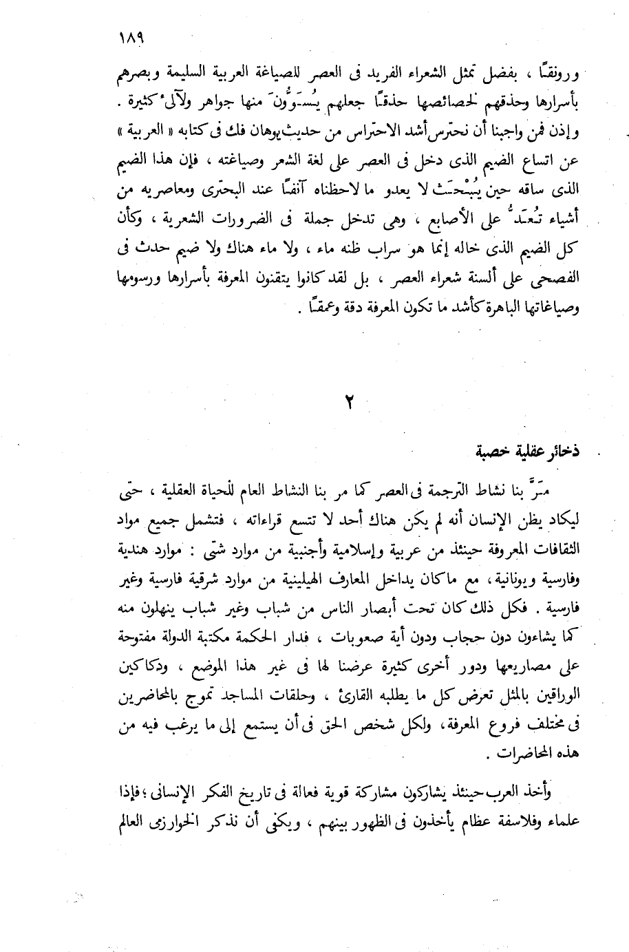 وإذن فمن واجبنا أن نحترس أشد الاحتراس من حديث يوهان فك فى كتابه «العربية» عن اتساع الضيم الذى دخل فى العصر على لغة الشعر وصياغته، فإن هذا الضيم الذى ساقه حين يبحث لا يعدو ما لاحظناه آنفا عند البحترى ومعاصريه من أشياء تعدّ على الأصابع، وهى تدخل جملة فى الضرورات الشعرية، وكأن كل الضيم الذى خاله إنما هو سراب ظنه ماء، ولا ماء هناك ولا ضيم حدث فى الفصحى على ألسنة شعراء العصر، بل لقد كانوا يتقنون المعرفة بأسرارها ورسومها وصياغاتها الباهرة كأشد ما تكون المعرفة دقة وعمقا.