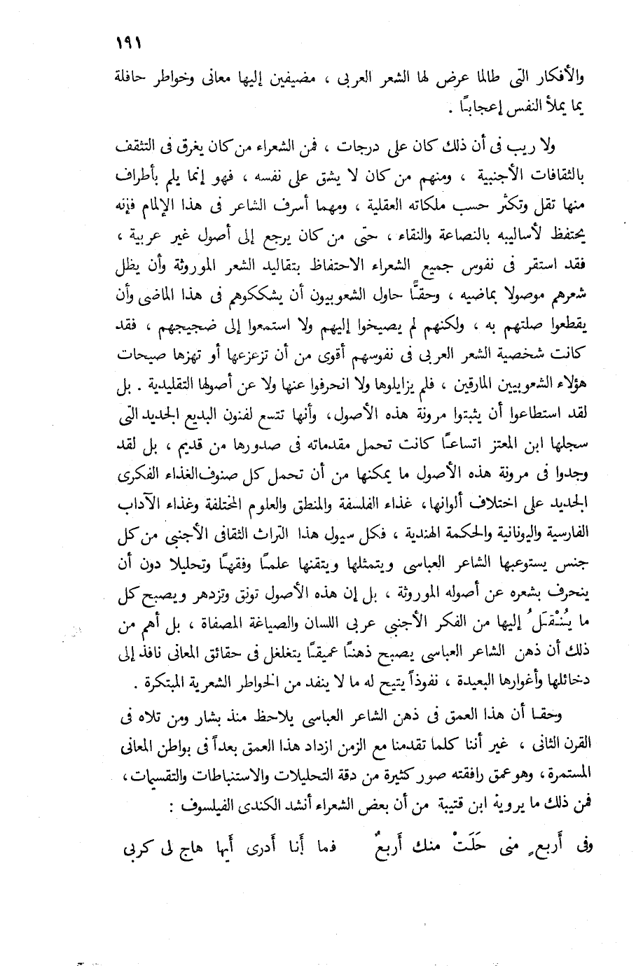ولا ريب فى أن ذلك كان على درجات، فمن الشعراء من كان يغرق فى التثقف بالثقافات الأجنبية، ومنهم من كان لا يشق على نفسه، فهو إنما يلم بأطراف منها تقل وتكثر حسب ملكاته العقلية، ومهما أسرف الشاعر فى هذا الإلمام فإنه يحتفظ لأساليبه بالنصاعة والنقاء، حتى من كان يرجع إلى أصول غير عربية، فقد استقر فى نفوس جميع الشعراء الاحتفاظ بتقاليد الشعر الموروثة وأن يطل شعرهم موصولا بماضيه، وحقّا حاول الشعوبيون أن يشككوهم فى هذا الماضى وأن يقطعوا صلتهم به، ولكنهم لم يصيخوا إليهم ولا استمعوا إلى ضجيجهم، فقد كانت شخصية الشعر العربى فى نفوسهم أقوى من أن تزعزعها أو تهزها صيحات هؤلاء الشعوبيين المارقين، فلم يزايلوها ولا انحرفوا عنها ولا عن أصولها التقليدية. بل لقد استطاعوا أن يثبتوا مرونة هذه الأصول، وأنها تتسع لفنون البديع الجديد التى سجلها ابن المعتز اتساعا كانت تحمل مقدماته فى صدورها من قديم، بل لقد وجدوا فى مرونة هذه الأصول ما يمكنها من أن تحمل كل صنوف الغذاء الفكرى الجديد على اختلاف ألوانها، غذاء الفلسفة والمنطق والعلوم المختلفة وغذاء الآداب الفارسية واليونانية والحكمة الهندية، فكل سيول هذا التراث الثقافى الأجنبى من كل جنس يستوعبها الشاعر العباسى ويتمثلها ويتقنها علما وفقها وتحليلا دون أن ينحرف بشعره عن أصوله الموروثة، بل إن هذه الأصول تونق وتزدهر ويصبح كل ما ينقل إليها من الفكر الأجنبى عربى اللسان والصياغة المصفاة، بل أهم من ذلك أن ذهن الشاعر العباسى يصبح ذهنا عميقا يتغلغل فى حقائق المعانى نافذ إلى دخائلها وأغوارها البعيدة، نفوذا يتيح له ما لا ينفد من الخواطر الشعرية المبتكرة.