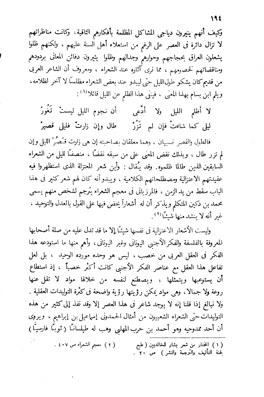 فالطول والقصر نسبيان، وهما معلقان بصاحبته إن هى زارت قصر الليل وإن لم تزر طال، وبذلك نقض المعنى على من سبقه نقضا، منصفا لليل من الشعراء السابقين الذين طالما ظلموه. وقد يقال: وأين شعر المعتزلة الذى استظهروا فيه عقيدتهم الاعتزالية ومصطلحاتهم الكلامية، ويبدو أنه كان لهم شعر كثير فى هذا الباب سقط من يد الزمن، فالمرزبانى فى معجم الشعراء يترجم لشخص منهم يسمى محمد بن دكين المتكلم ويذكر أن له أشعارا يحض فيها على القول بالعدل والتوحيد، غير أنه لا ينشد منها شيئا (¬2).