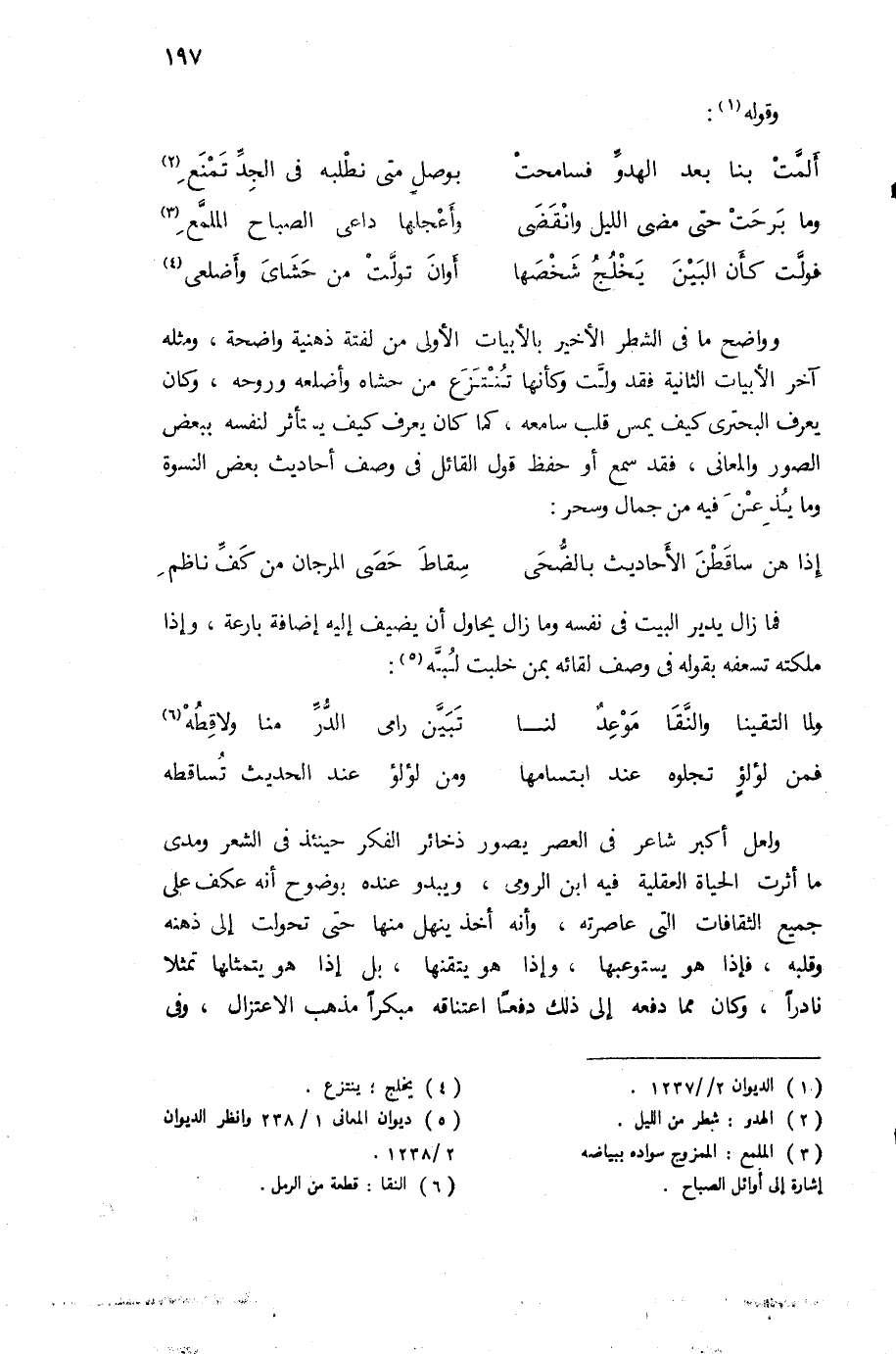 وواضح ما فى الشطر الأخير بالأبيات الأولى من لفتة ذهنية واضحة، ومثله آخر الأبيات الثانية فقد ولّت وكأنها تنتزع من حشاه وأضلعه وروحه، وكان يعرف البحترى كيف يمس قلب سامعه، كما كان يعرف كيف يستأثر لنفسه ببعض الصور والمعانى، فقد سمع أو حفظ قول القائل فى وصف أحاديث بعض النسوة وما يذعن فيه من جمال وسحر: