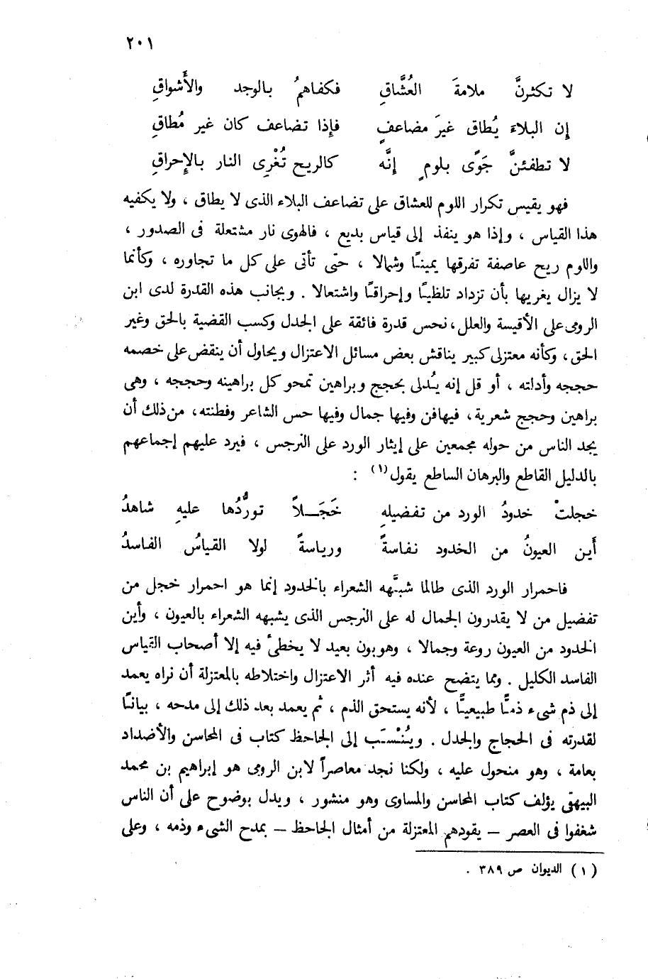 فاحمرار الورد الذى طالما شبّهه الشعراء بالخدود إنما هو احمرار خجل من تفضيل من لا يقدرون الجمال له على النرجس الذى يشبهه الشعراء بالعيون، وأين الخدود من العيون روعة وجمالا، وهو بون بعيد لا يخطئ فيه إلا أصحاب القياس الفاسد الكليل. ومما يتضح عنده فيه أثر الاعتزال واختلاطه بالمعتزلة أن نراه يعمد إلى ذم شئ ذمّا طبيعيّا، لأنه يستحق الذم، ثم يعمد بعد ذلك إلى مدحه، بيانا لقدرته فى الحجاج والجدل. وينسب إلى الجاحظ كتاب فى المحاسن والأضداد بعامة، وهو منحول عليه، ولكنا نجد معاصرا لابن الرومى هو إبراهيم بن محمد البيهقى يؤلف كتاب المحاسن والمساوى وهو منشور، ويدل بوضوح على أن الناس شغفوا فى العصر-يقودهم المعتزلة من أمثال الجاحظ-بمدح الشئ وذمه، وعلى