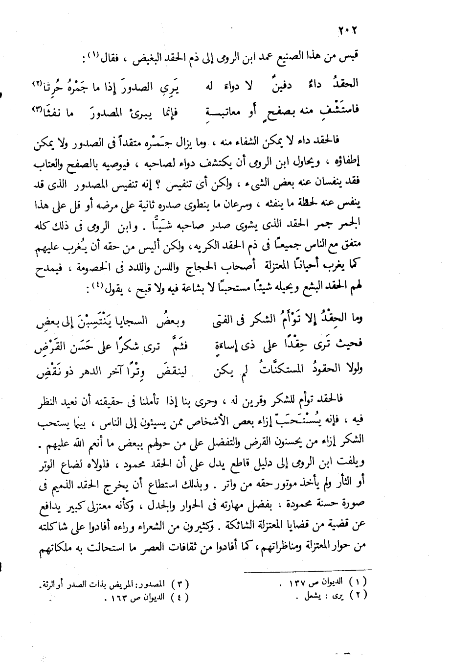 فالحقد داء لا يمكن الشفاء منه، وما يزال جمره متقدا فى الصدور ولا يمكن إطفاؤه، ويحاول ابن الرومى أن يكتشف دواء لصاحبه، فيوصيه بالصفح والعتاب فقد ينفسان عنه بعض الشئ، ولكن أى تنفيس؟ إنه تنفيس المصدور الذى قد ينفس عنه لحظة ما ينفثه، وسرعان ما ينطوى صدره ثانية على مرضه أو قل على هذا الجمر جمر الحقد الذى يشوى صدر صاحبه شيّا. وابن الرومى فى ذلك كله متفق مع الناس جميّعا فى ذم الحقد الكريه، ولكن أليس من حقه أن يغرب عليهم كما يغرب أحيانا المعتزلة أصحاب الحجاج واللسن واللدد فى الخصومة، فيمدح لهم الحقد البشع ويحيله شيئا مستحبا لا بشاعة فيه ولا قبح، يقول (¬4):