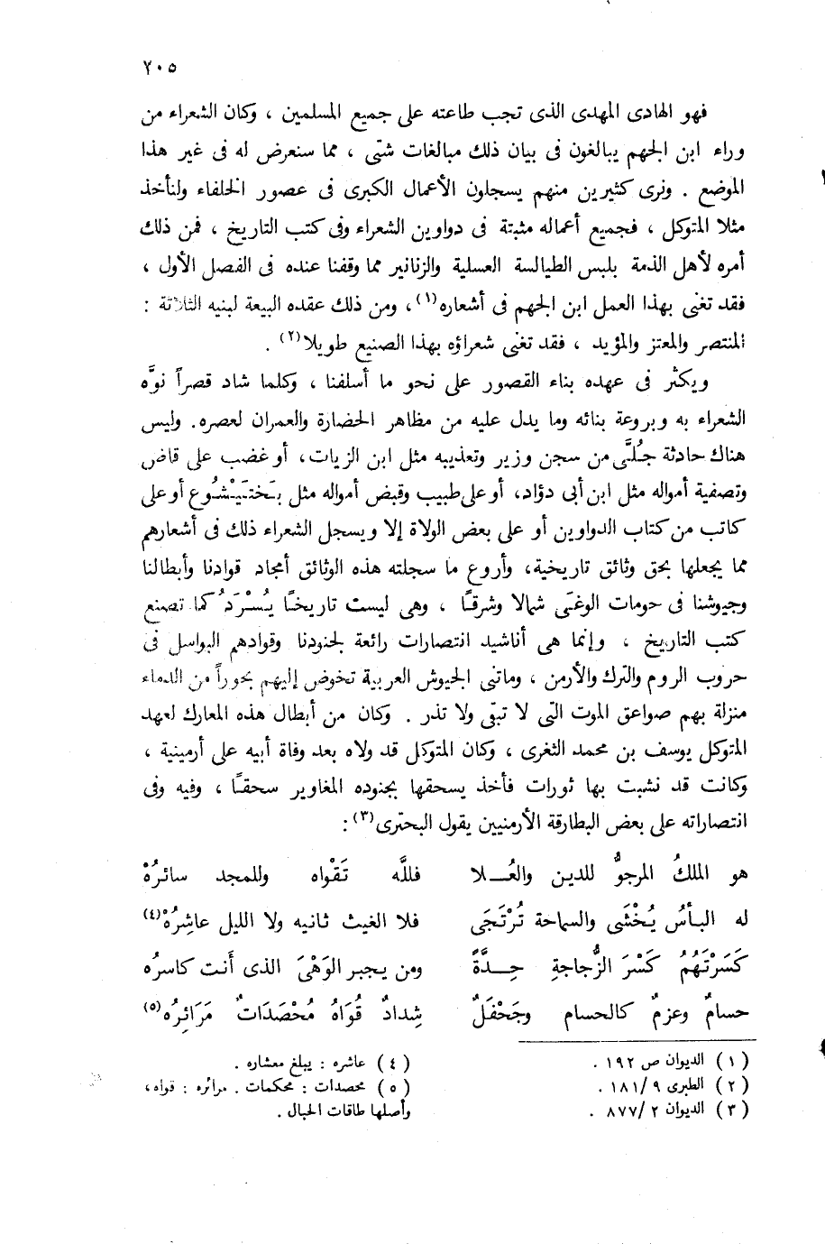 فهو الهادى المهدى الذى تجب طاعته على جميع المسلمين، وكان الشعراء من وراء ابن الجهم يبالغون فى بيان ذلك مبالغات شتى، مما سنعرض له فى غير هذا الموضع. ونرى كثيرين منهم يسجلون الأعمال الكبرى فى عصور الخلفاء ولنأخذ مثلا المتوكل، فجميع أعماله مثبتة فى دواوين الشعراء وفى كتب التاريخ، فمن ذلك أمره لأهل الذمة بلبس الطيالسة العسلية والزنانير مما وقفنا عنده فى الفصل الأول، فقد تغنى بهذا العمل ابن الجهم فى أشعاره (¬1)، ومن ذلك عقده البيعة لبنيه الثلاثة: