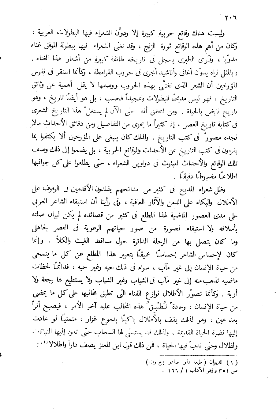 وظل شعراء المديح فى كثير من مدائحهم يقلدون الأقدمين فى الوقوف على الأطلال والبكاء على الدمن والآثار العافية، وفى رأينا أن استبقاء الشاعر العربى على مدى العصور الماضية لهذا المطلع فى كثير من قصائده لم يكن لبيان صلته بأسلافه ولا استبقاء لصورة من صور حياتهم الرعوية فى العصر الجاهلى وما كان يتصل بها من الرحلة الدائرة حول مساقط الغيث والكلأ، وإنما كان لإحساس الشاعر إحساسا عميقا بتعبير هذا المطلع عن كل ما ينمحى من حياة الإنسان إلى غير مآب، سواء فى ذلك حبه وغير حبه، فدائما لحظات ماضيه تذهب منه إلى غير مآب فى الشباب وغير الشباب ولا يستطيع لها رجعة ولا أوبة. وكأنما تصوّر الأطلال نوازع الفناء التى تطبق مخالبها على كل ما يمضى من حياة الإنسان، وعادة تطبق هذه المخالب عليه آخر الأمر، فيصبح أثرا بعد عين، وهو لذلك يقف بالأطلال باكيا بدموع غزار، متمنيا لو عادت إليها نضرة الحياة القديمة، ولذلك قد يستسقى لها السحاب حتى تعود إليها النباتات والظلال وحتى تدبّ فيها الحياة، فمن ذلك قول ابن المعتز يصف دارا وأطلالا (¬1):