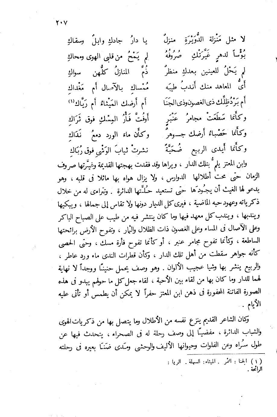 وابن المعتز يلمّ بتلك الدار، ويراها وقد فقدت بهجتها القديمة وغيّرتها صروف الزمان حتى محت أطلالها الدوارس، ولا يزال هواه بها ماثلا فى قلبه، وهو يدعو لها الغيث أن يجودها حتى تستعيد حلّتها الداثرة. وتتراءى له من خلال ذكرياته وعهود حبه الماضية، فيرى كل الديار دونها ولا تقاس إلى جمالها، ويبكيها ويندبها، ويندب كل معهد فيها وما كان ينتشر فيه من طيب على الصباح الباكر وعلى الآصال فى المساء وعلى الغصون ذات الظلال والثمار، وتفوح الأرض برائحتها الساطعة، وكأنما تفوح مجامر عنبر، أو كأنما تفوح فأرة مسك، وحتى الحصى كأنه جواهر سقطت من أهل تلك الدار، وكأن قطرات الندى ماء ورد عاطر، والربيع ينشر بها وشيا عجيب الألوان. وهو وصف يحمل حنينا ووجدا لا نهاية لهما للدار وما كان بها من لقاء بين الأحبة، لقاء جعل كل ما حولهم يبدو فى هذه الصورة القاتنة المحفورة فى ذهن ابن المعتز حفرا لا يمكن أن يطمس أو تأتى عليه الأيام.