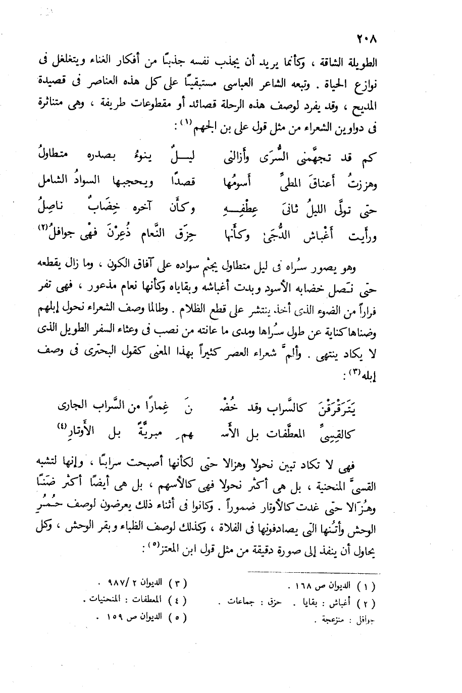 وهو يصور سراه فى ليل متطاول يجثم سواده على آفاق الكون، وما زال يقطعه حتى نصل خضابه الأسود وبدت أغباشه وبقاياه وكأنها نعام مذعور، فهى تفر فرارا من الضوء الذى أخد ينتشر على قطع الظلام. وطالما وصف الشعراء نحول إبلهم وضناها كناية عن طول سراها ومدى ما عانته من نصب فى وعثاء السفر الطويل الذى لا يكاد ينتهى. وألمّ شعراء العصر كثيرا بهذا المعنى كقول البحترى فى وصف ابله (¬3):