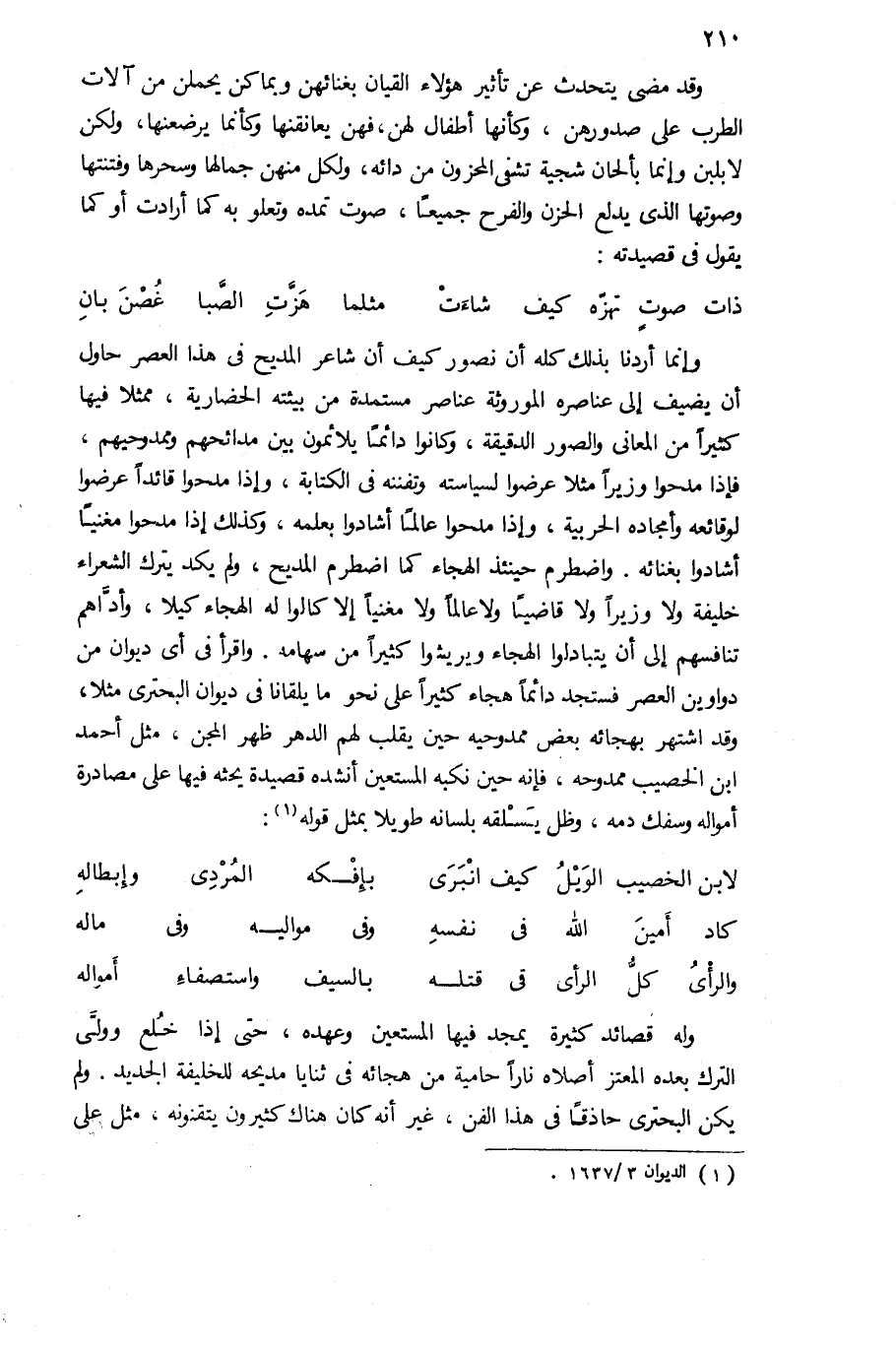 وإنما أردنا بذلك كله أن نصور كيف أن شاعر المديح فى هذا العصر حاول أن يضيف إلى عناصره الموروثة عناصر مستمدة من بيئته الحضارية، ممثلا فيها كثيرا من المعانى والصور الدقيقة، وكانوا دائما يلائمون بين مدائحهم وممدوحيهم، فإذا مدحوا وزيرا مثلا عرضوا لسياسته وتفننه فى الكتابة، وإذا منحوا قائدا عرضوا لوقائعه وأمجاده الحربية، وإذا مدحوا عالما أشادوا بعلمه، وكذلك إذا مدحوا مغنيا أشادوا بغنائه. واضطرم حينئذ الهجاء كما اضطرم المديح، ولم يكد يترك الشعراء خليفة ولا وزيرا ولا قاضيا ولا عالما ولا مغنيا إلا كالوا له الهجاء كيلا، وأدّاهم تنافسهم إلى أن يتبادلوا الهجاء ويريشوا كثيرا من سهامه. واقرأ فى أى ديوان من دواوين العصر فستجد دائما هجاء كثيرا على نحو ما يلقانا فى ديوان البحترى مثلا، وقد اشتهر بهجائه بعض ممدوحيه حين يقلب لهم الدهر ظهر المجن، مثل أحمد ابن الخصيب ممدوحه، فإنه حين نكبه المستعين أنشده قصيدة يحثه فيها على مصادرة أمواله وسفك دمه، وظل يسلقه بلسانه طويلا بمثل قوله (¬1):