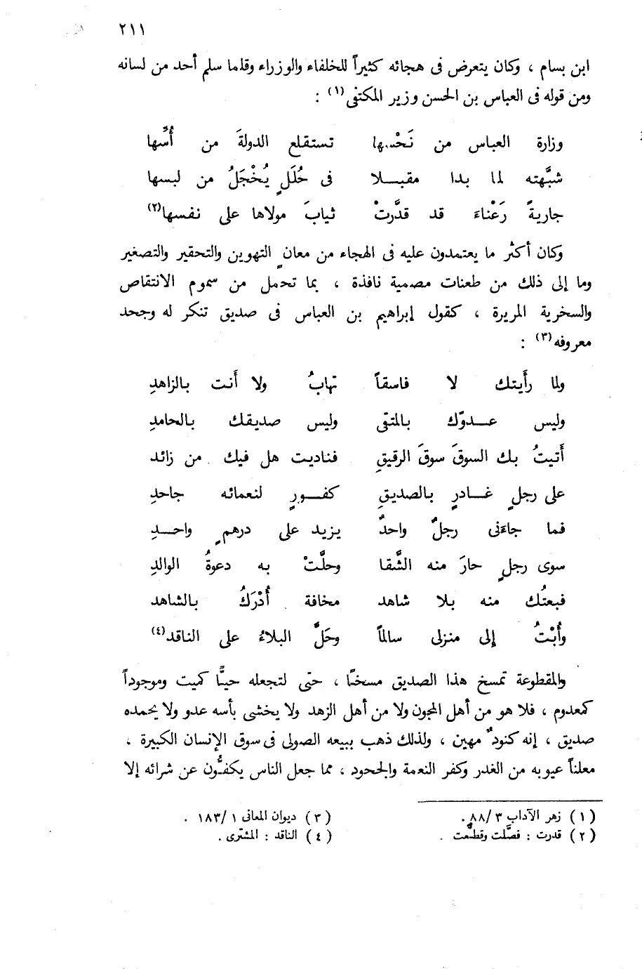 وكان أكثر ما يعتمدون عليه فى الهجاء من معان التهوين والتحقير والتصغير وما إلى ذلك من طعنات مصمية نافذة، بما تحمل من سموم الانتقاص والسخرية المريرة، كقول إبراهيم بن العباس فى صديق تنكر له وجحد معروفه (¬3):