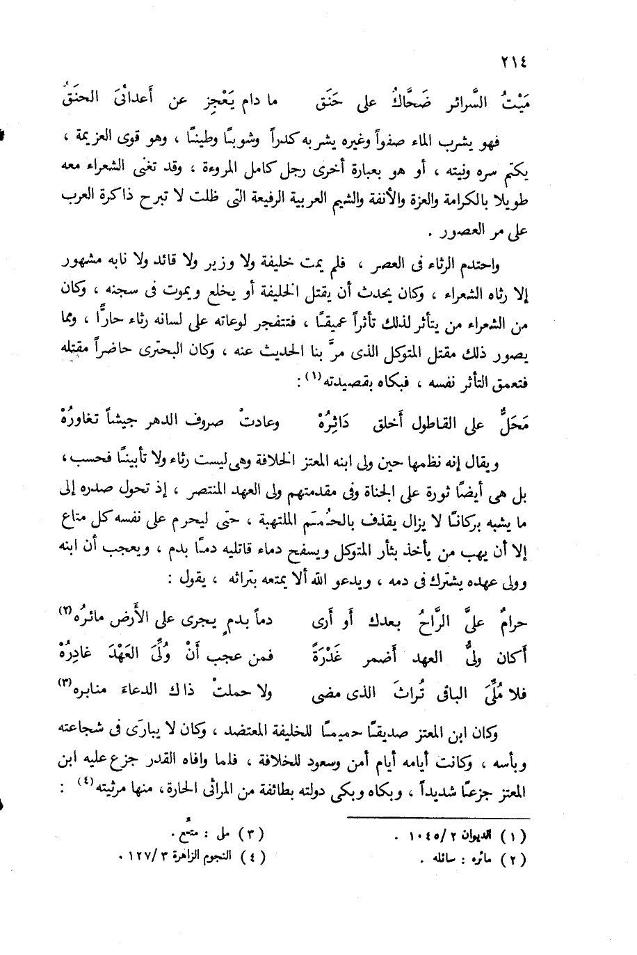 واحتدم الرثاء فى العصر، فلم يمت خليفة ولا وزير ولا قائد ولا نابه مشهور إلا رثاه الشعراء، وكان يحدث أن يقتل الخليفة أو يخلع ويموت فى سجنه، وكان من الشعراء من يتأثر لذلك تأثرا عميقا، فتتفجر لوعاته على لسانه رثاء حارّا، ومما يصور ذلك مقتل المتوكل الذى مرّ بنا الحديث عنه، وكان البحترى حاضرا مقتله فتعمق التأثر نفسه، فبكاه بقصيدته (¬1):