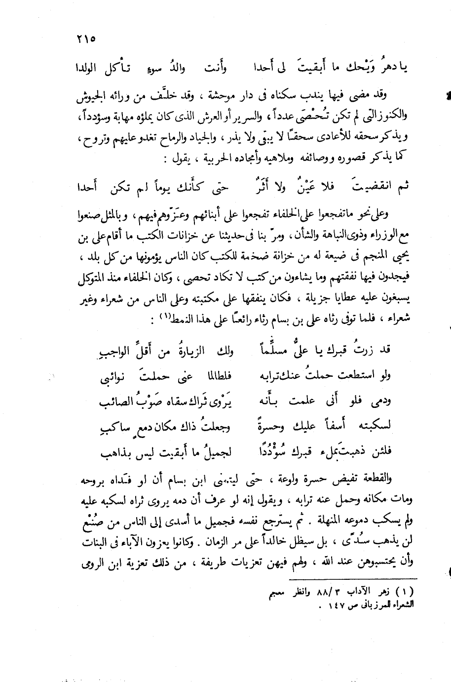 وعلى نحو ما تفجعوا على الخلفاء تفجعوا على أبنائهم وعزّوهم فيهم، وبالمثل صنعوا مع الوزراء وذوى النباهة والشأن، ومرّ بنا فى حديثنا عن خزانات الكتب ما أقام على بن يحيى المنجم فى ضيعة له من خزانة ضخمة للكتب كان الناس يؤمونها من كل بلد، فيجدون فيها نفقتهم وما يشاءون من كتب لا تكاد تحصى، وكأن الخلفاء منذ المتوكل يسبغون عليه عطايا جزيلة، فكان ينفقها على مكتبته وعلى الناس من شعراء وغير شعراء، فلما توفى رثاه على بن بسام رثاء رائعا على هذا النمط (¬1):