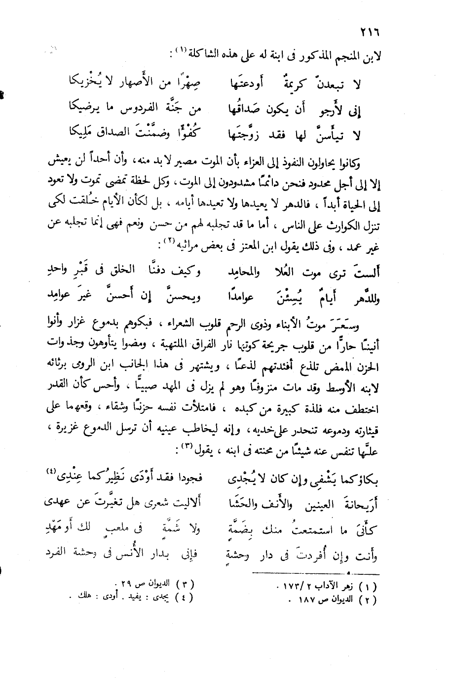 وكانوا يحاولون النفوذ إلى العزاء بأن الموت مصير لا بد منه، وأن أحدا لن يعيش إلا إلى أجل محدود فنحن دائما مشدودون إلى الموت، وكل لحظة تمضى تموت ولا تعود إلى الحياة أبدا، فالدهر لا يعيدها ولا تعيدها أيامه، بل لكأن الأيام خلقت لكى تنزل الكوارث على الناس، أما ما قد تجلبه لهم من حسن ونعم فهى إنما تجلبه عن غير عمد، وفى ذلك يقول ابن المعتز فى بعض مراثيه (¬2):