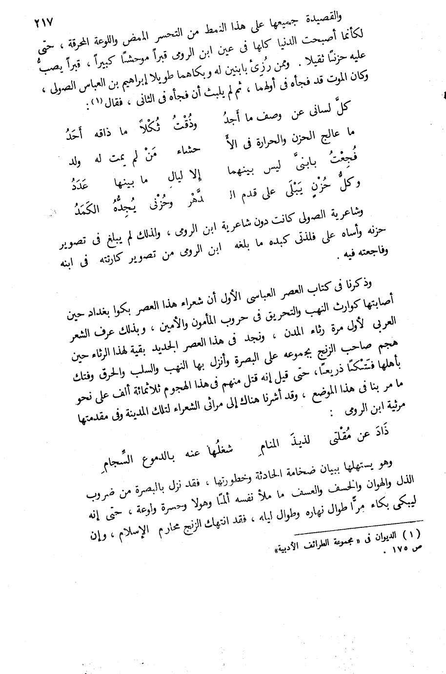 والقصيدة جميعها على هذا النمط من التحسر الممض واللوعة المحرقة، حتى لكأنما أصبحت الدنيا كلها فى عين ابن الرومى قبرا موحشا كبيرا، قبرا يصبّ عليه حزنا ثقيلا. وممن رزئ بابنين له وبكاهما طويلا إبراهيم بن العباس الصولى، وكان الموت قد فجأه فى أولهما، ثم لم يلبث أن فجأه فى الثانى، فقال (¬1):